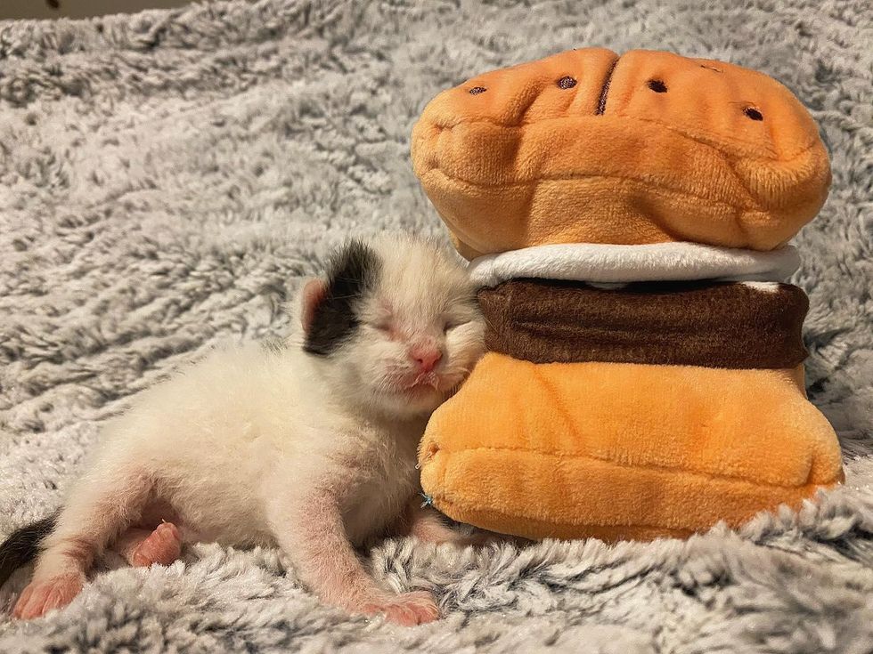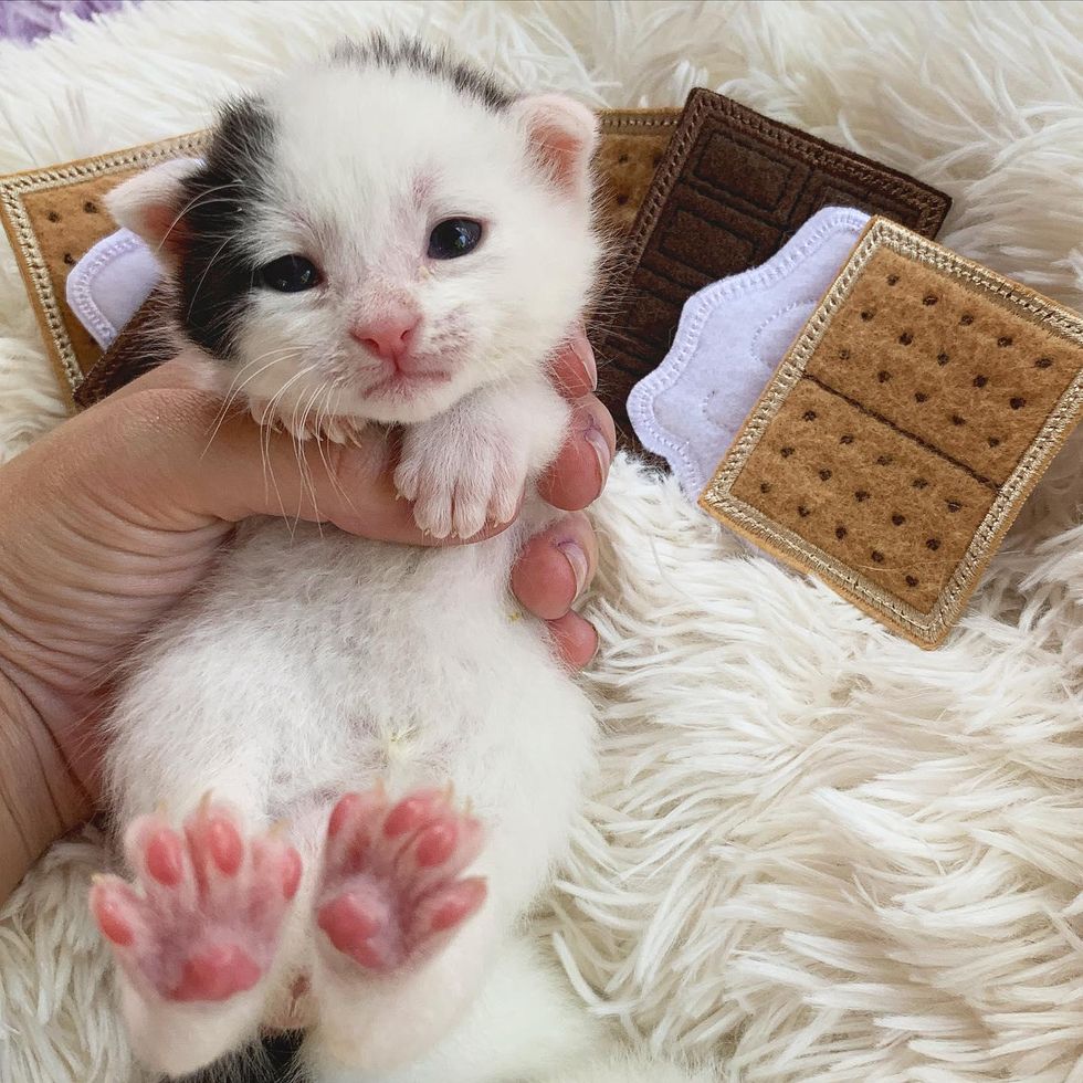 The cow kittens were named Graham, Mal (short for Marshmallow), and Hershey after S'mores. A few days later, their eyes peeped open and they looked around, trying to figure out their surroundings.