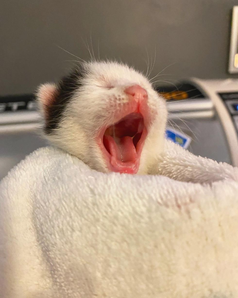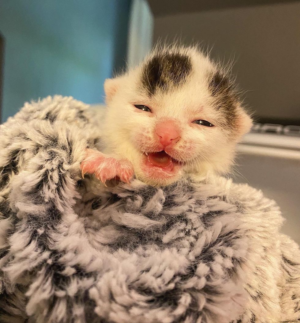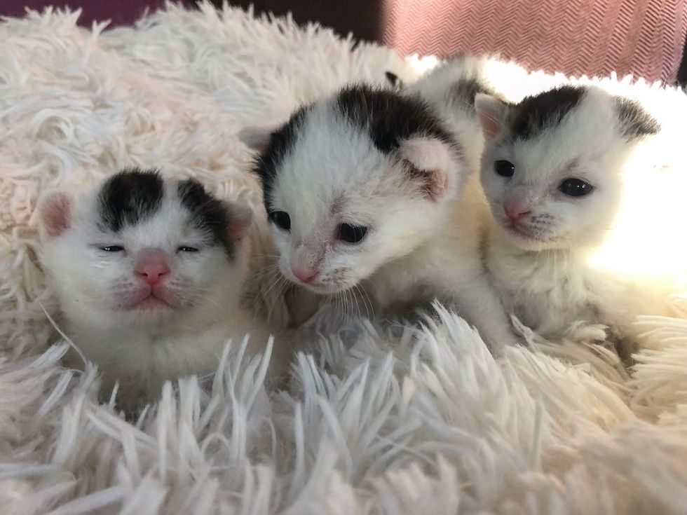 A feline trio was brought to Sparkle Cat Rescue (in North Carolina), in need of bottle feedings and lots of TLC. These orphaned kittens with cow markings were just a few days old and still had their eyes closed.