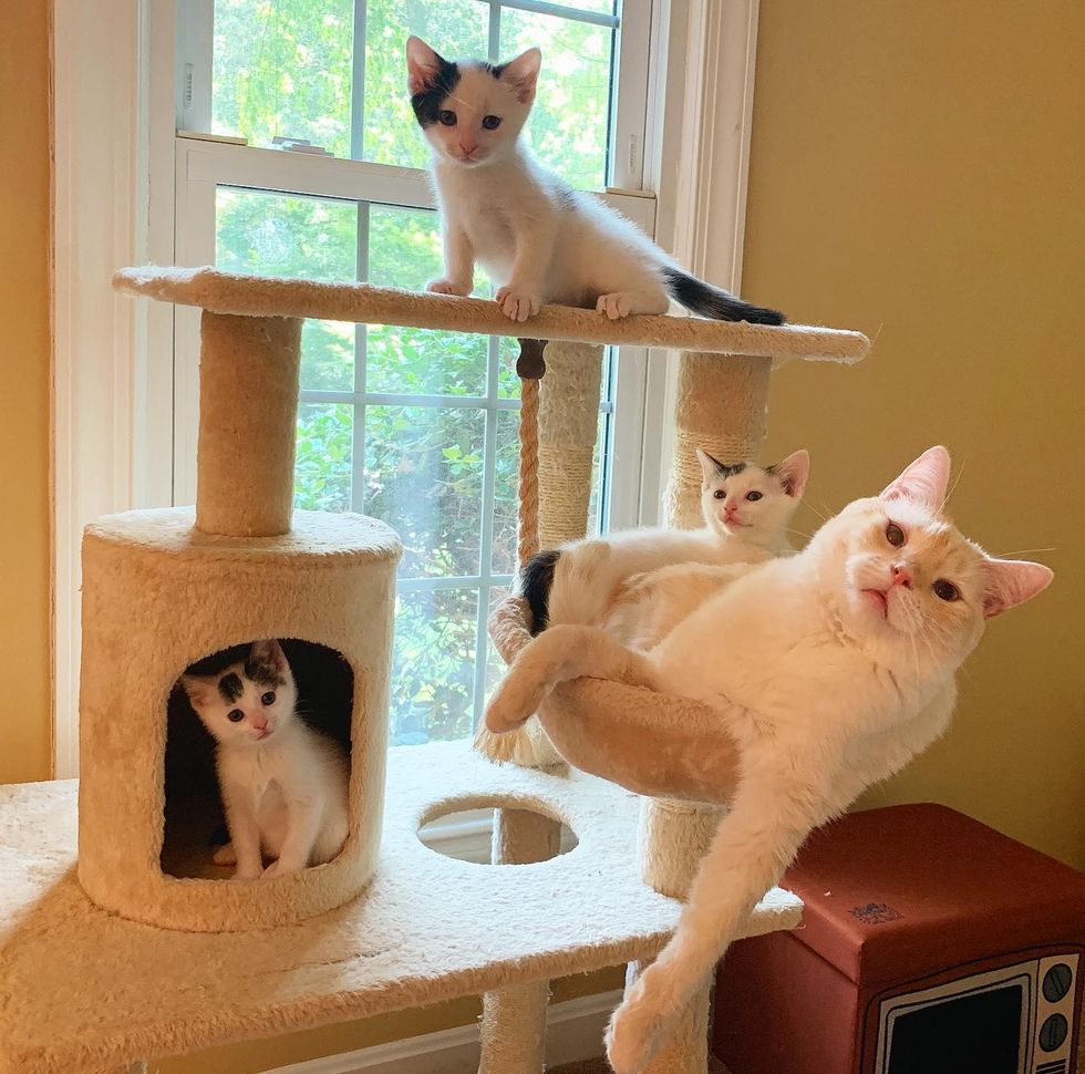 Sarah's resident cat Tio, who has a soft spot for kittens in need, came to offer some feline wisdom to the little ones. He stayed with the kittens, taught them boundaries and showered them with love.