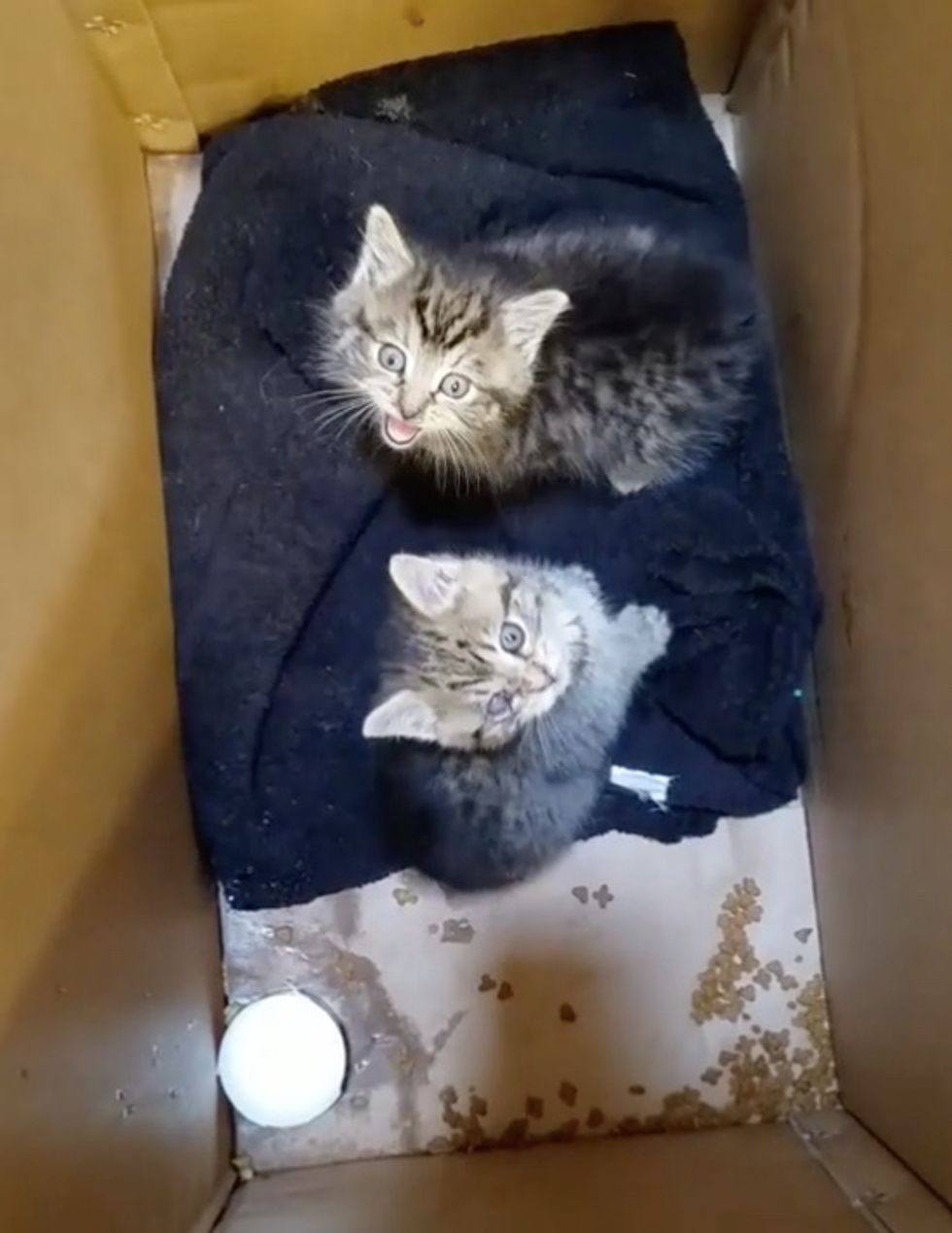 They scooped them up and brought the kittens to the leasing office where they tried to feed them some kibble, but the kittens were not weaned and didn't know how to eat solid food.