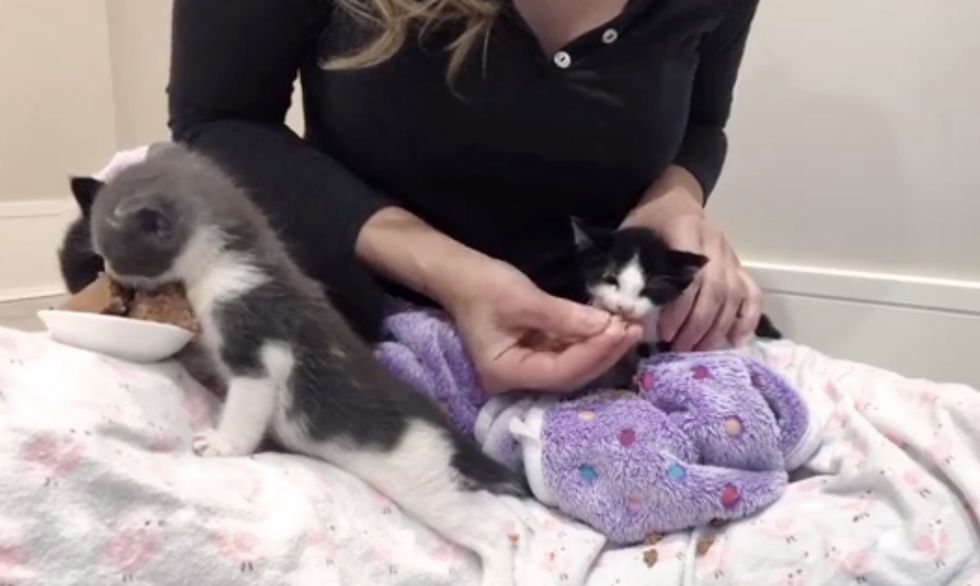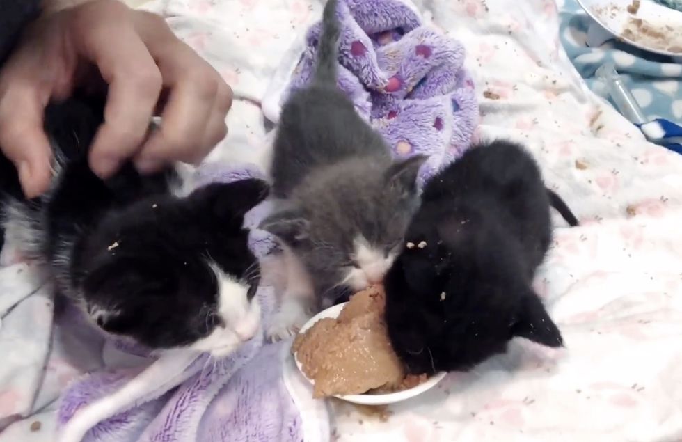 The kittens were given food and plenty of cuddles that day. "They were super hungry and dehydrated, but have been doing really well with their bottles."