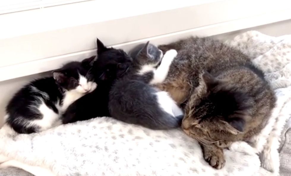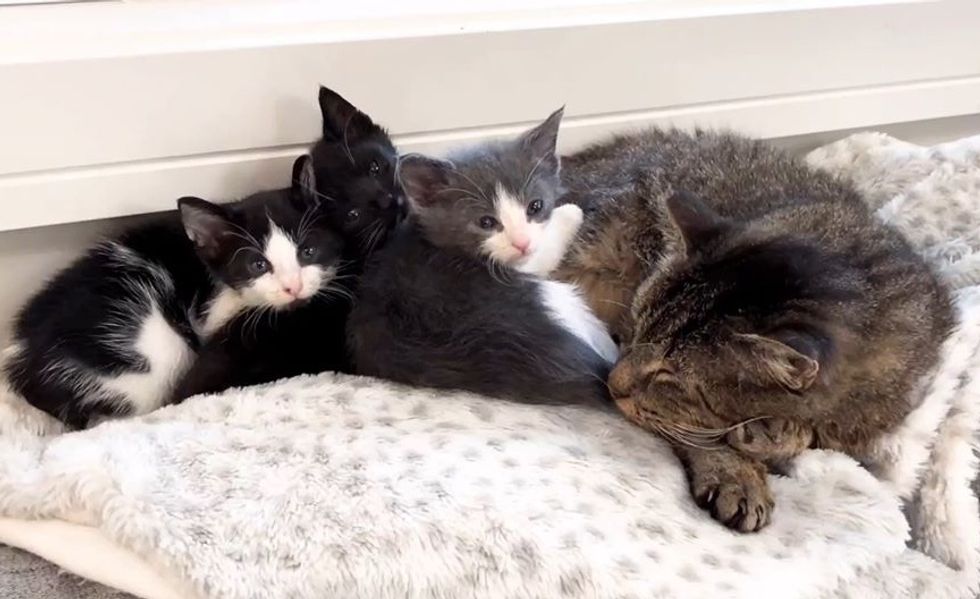 As for now, the kittens have found a nurturing older cat to cuddle with and love on.