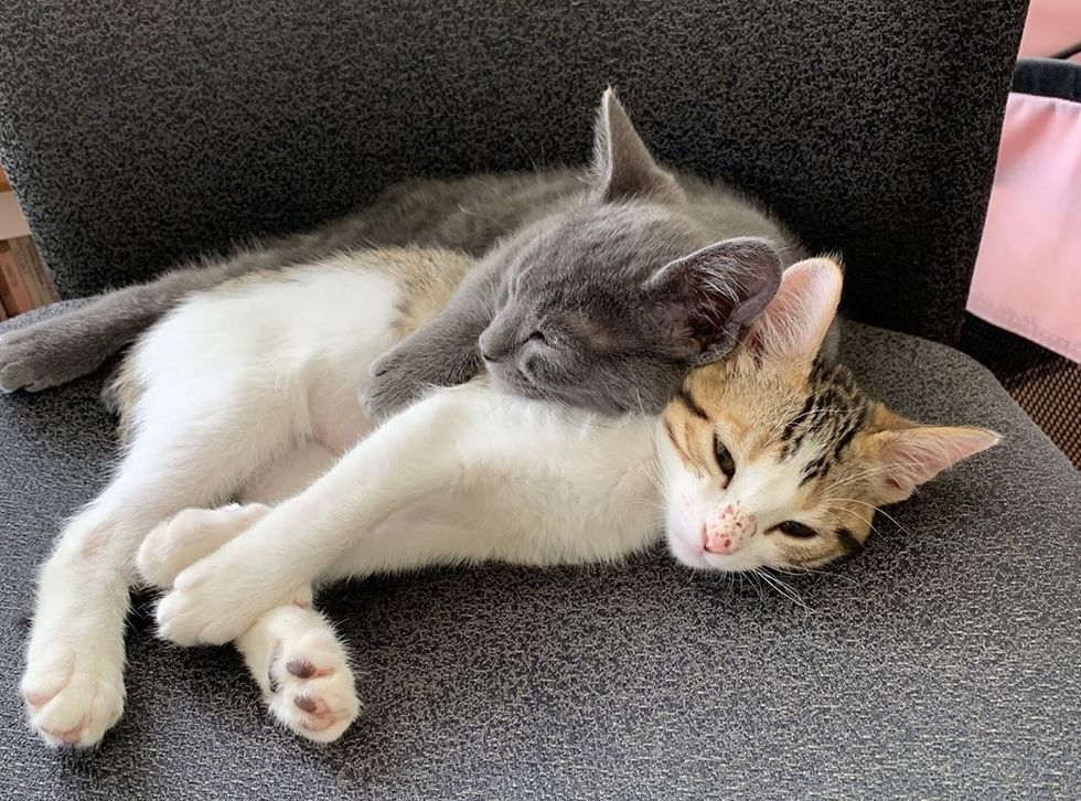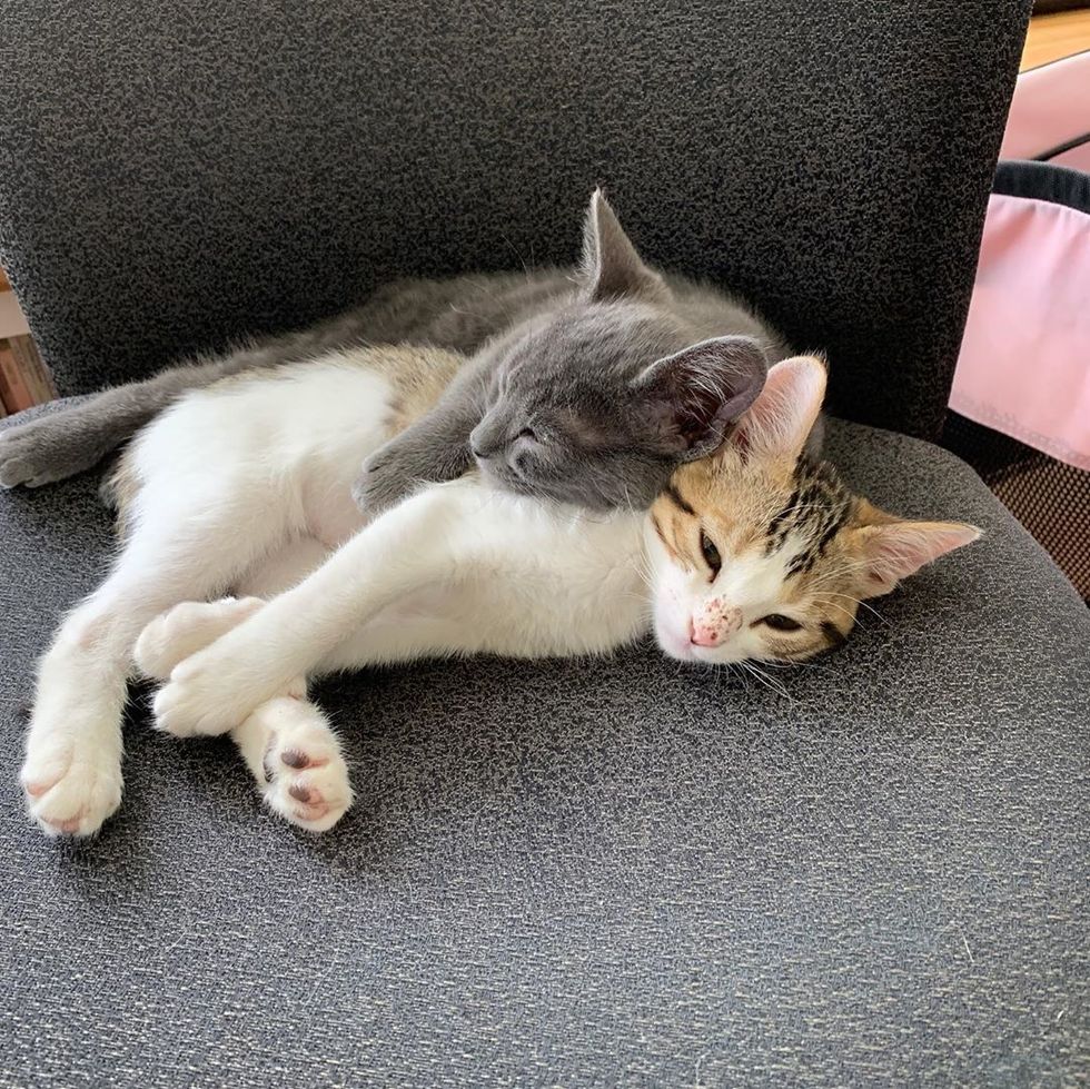 Two kittens walked into a humane trap together when they were rescued. They share an inseparable bond.