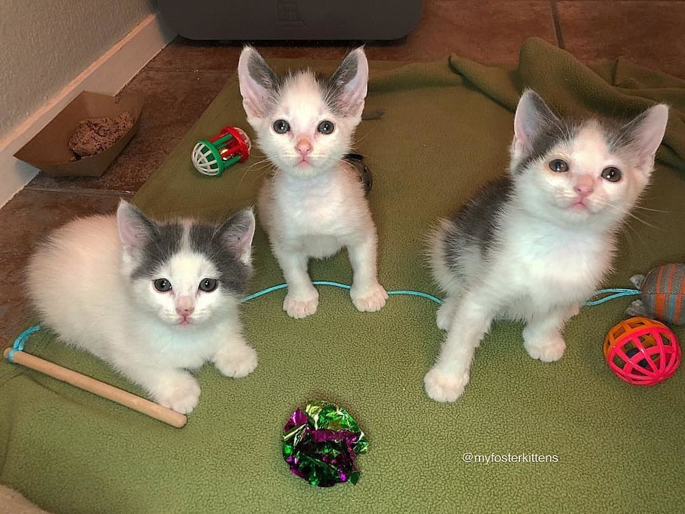 The three kittens are thriving in foster care. "They love toys and seem to be playing non-stop."