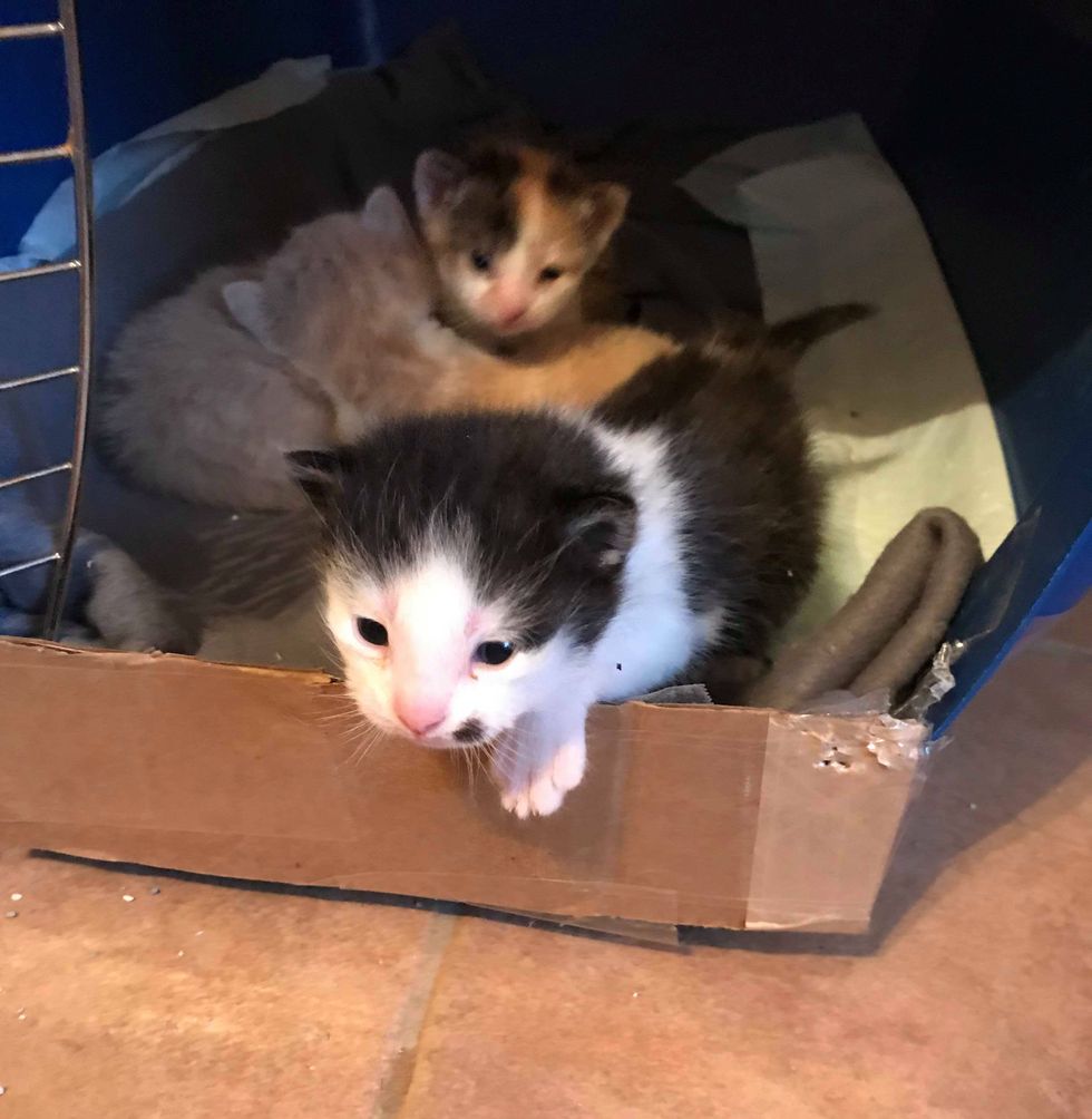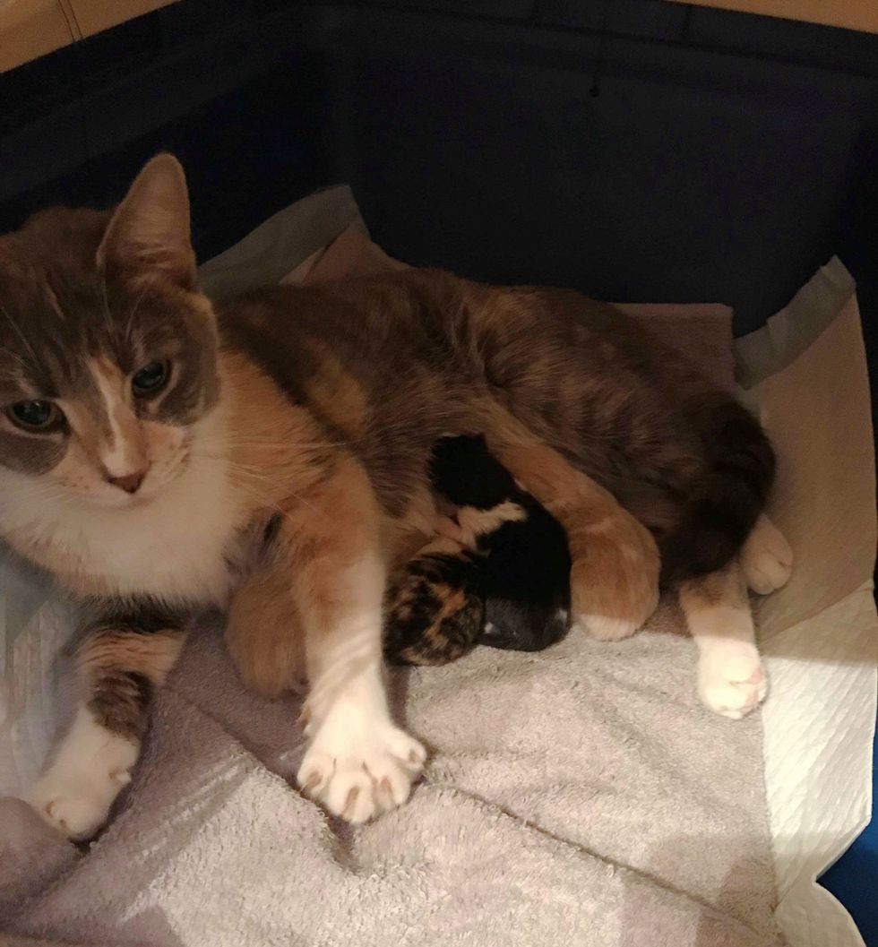 "She hadn't made a sound all night, so we had no idea she had gone into labor. The space and the kittens were all cleaned up," Katrina said. "She kept them in a carrier for weeks until they started being able to come out on their own."