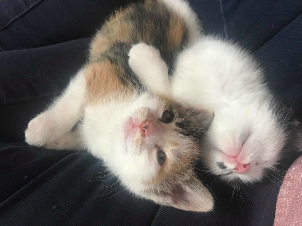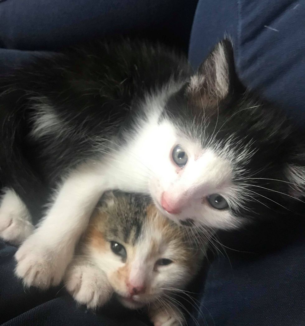 The two siblings like to follow each other around and often wind up cuddling together, falling asleep on their foster mom's lap.