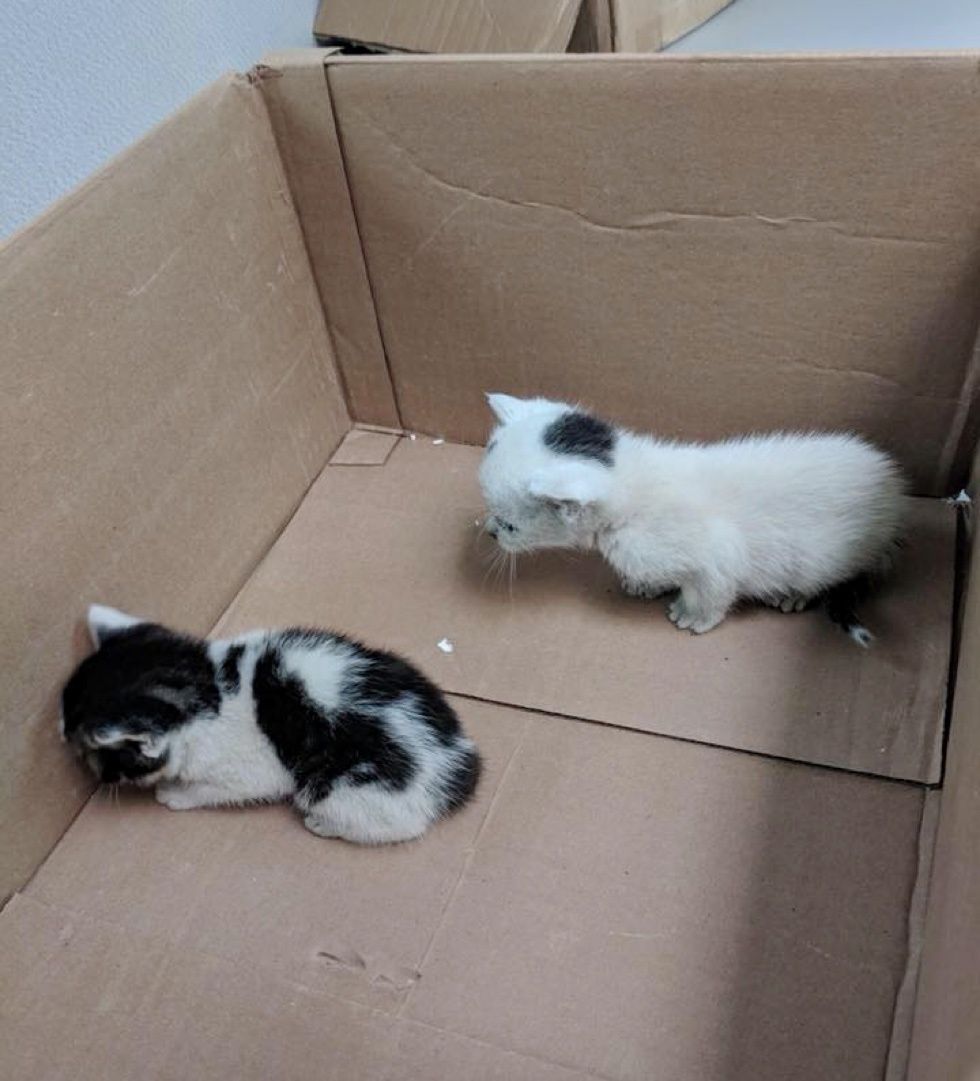Two little flea-infested kittens were found crying for help on a loading dock at a warehouse in North Bergen, New Jersey.