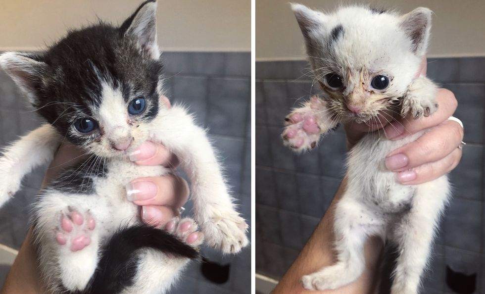 Athina, an animal rescuer/foster based in New Jersey, saw their plea on Facebook. "Mom cat was moving her babies but never came back for these two," Athina told Love Meow. "I got in contact with the person who worked on the dock and went to pick them up. They were covered in dirt and fleas."