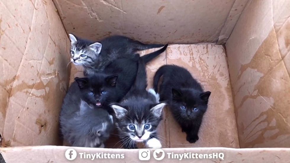 TinyKittens, a rescue group based in Fort Langley, British Columbia, was contacted about a litter of kittens needing rescue. A Good Samaritan heard them crying during a rain storm and found them in a cardboard box by a dumpster.