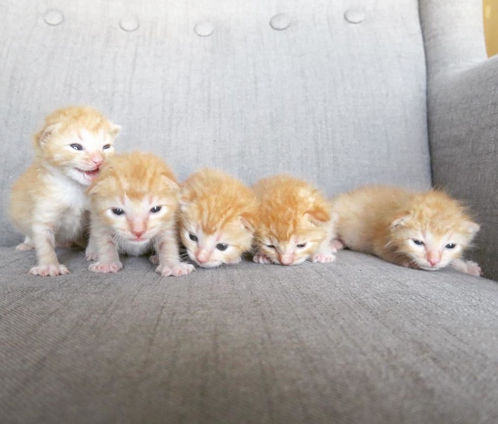 "The kittens were 2-3 days old when they arrived — the first bottle babies at the shelter this season," Megyn told Love Meow. "Four were between 90-100 grams, but little Brie (the runt) came in at 77 grams."