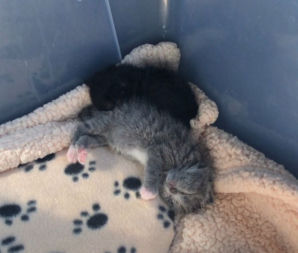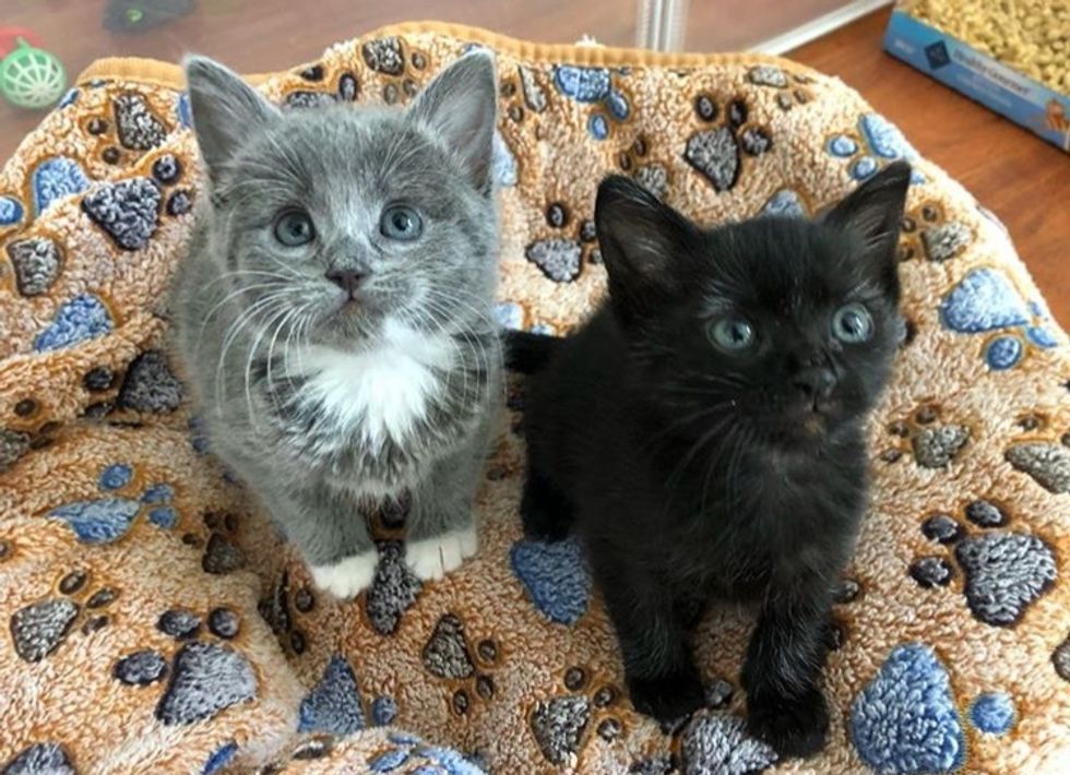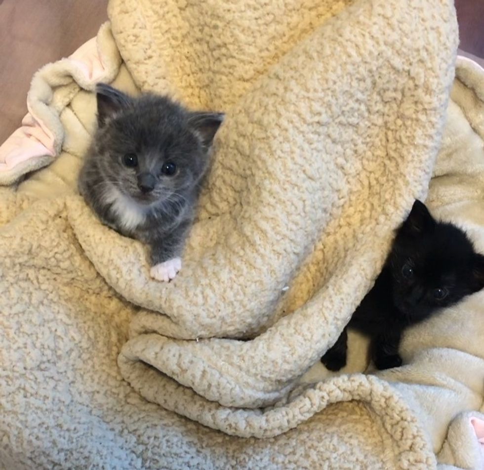 A litter of newborn kittens were located at a school in Nevada. Their mother was nowhere to be found. Staff decided to work as a team to bottle feed the feline babies. An employee took the little runt along with a gray kitten that she was clinging to.