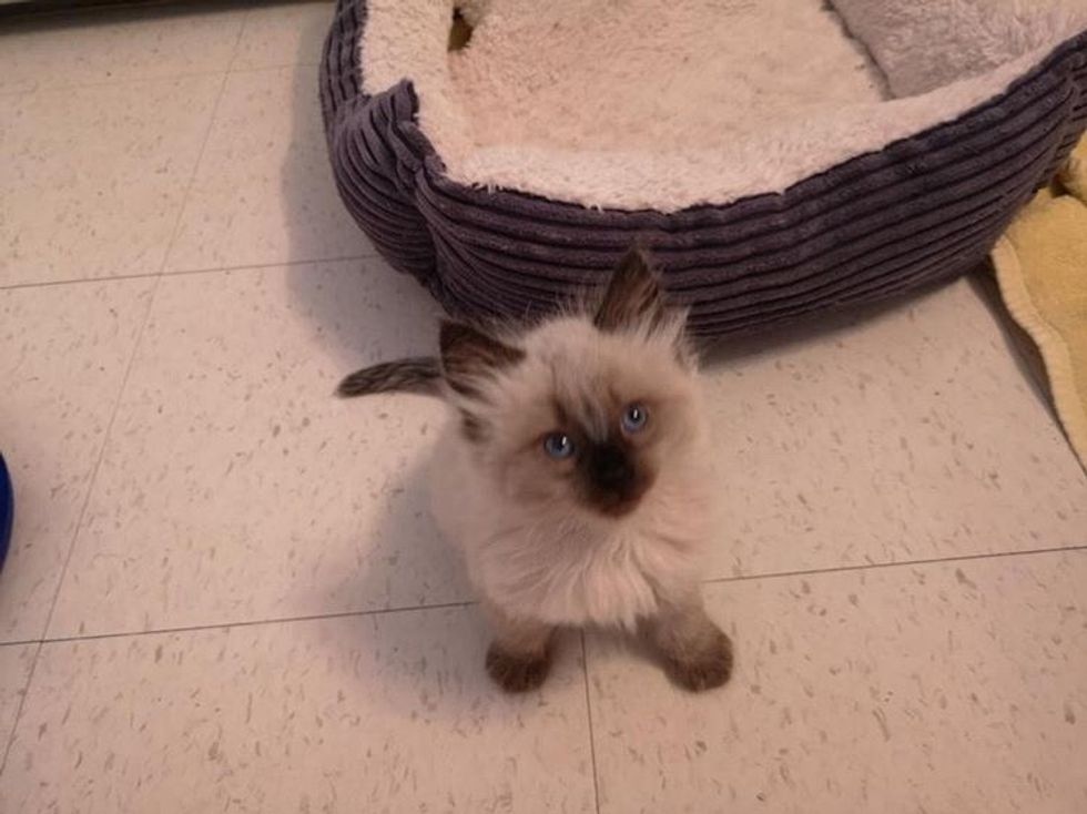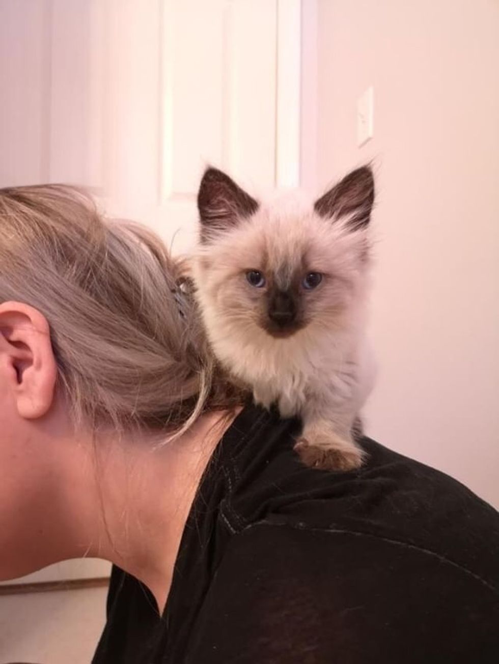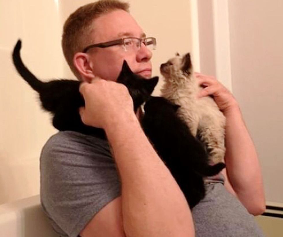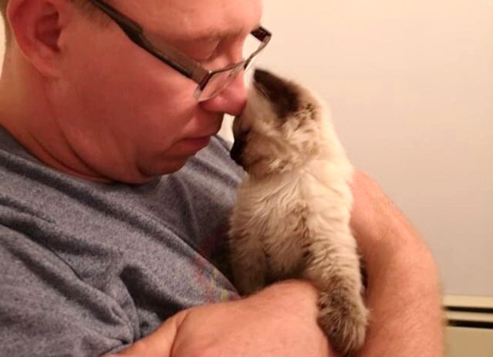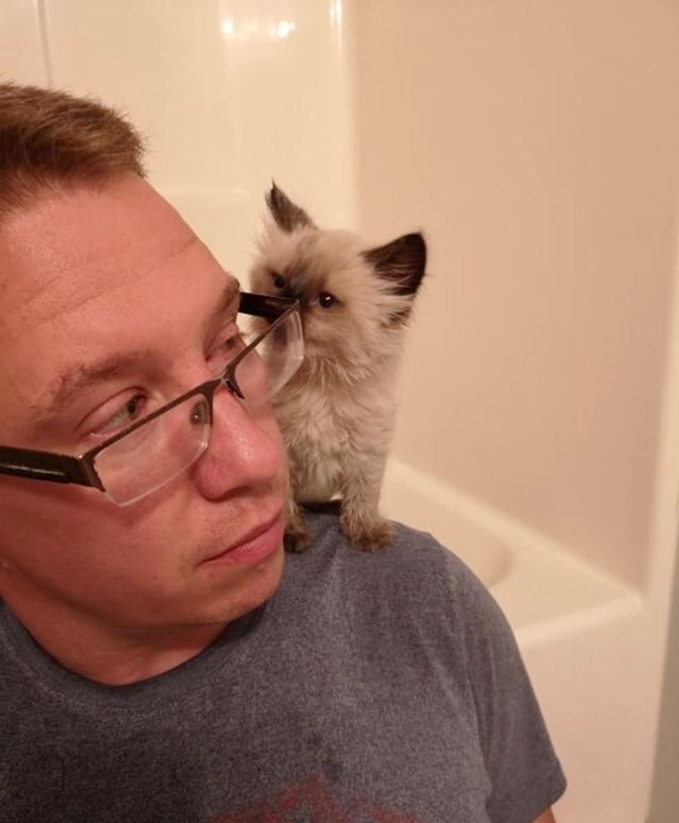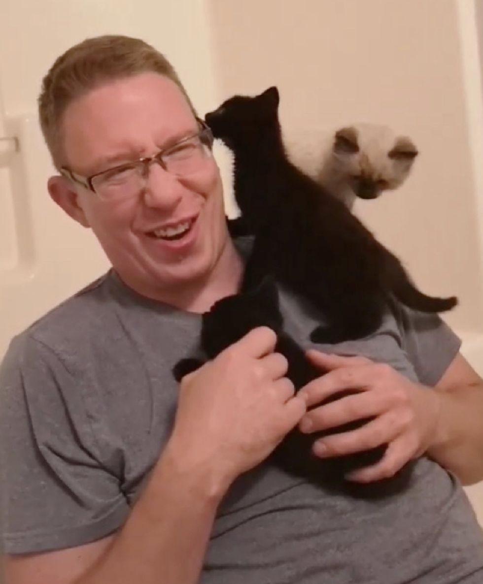 The trio immediately took to Dennis as if they thought he was their "mom." The little Ragdoll-mix kitty hopped right onto his shoulder and decided he would like to be carried around the house.