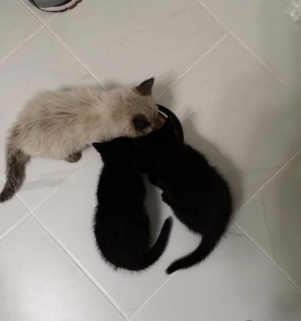 When they arrived, Barbara had already prepared a bowl of food. All three kitties quickly corralled around it and went to town.