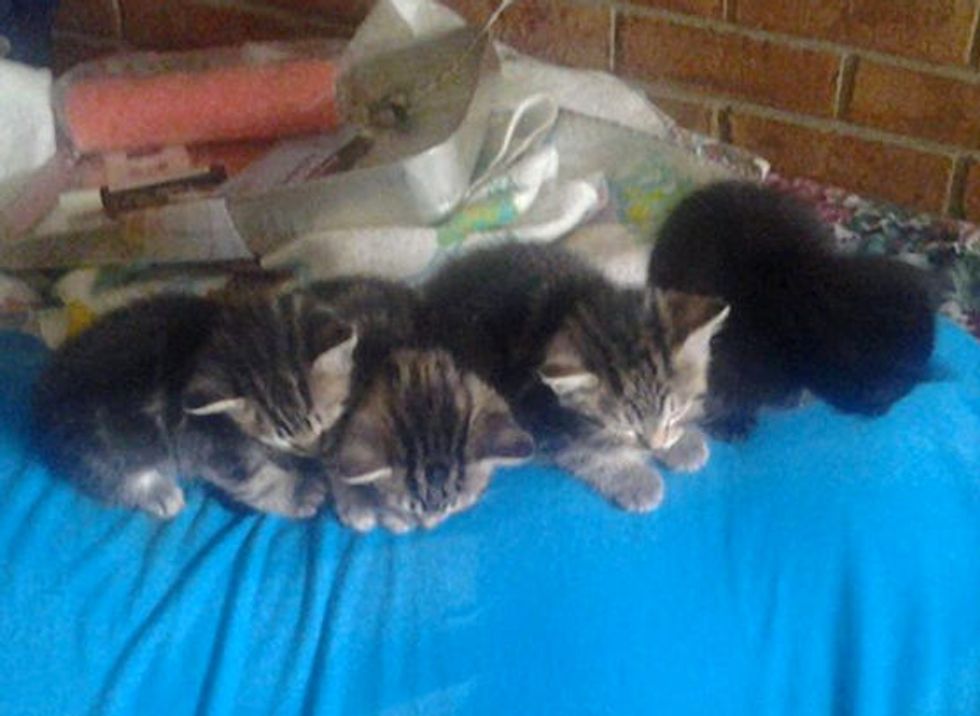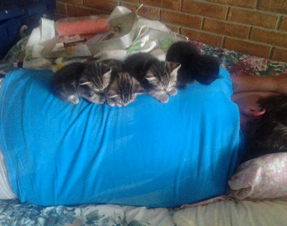 Four teeny bitty kittens just came to their new home, and already they found someone to latch on. "This is how I find my husband and our four new additions," said the human mom via reddit.