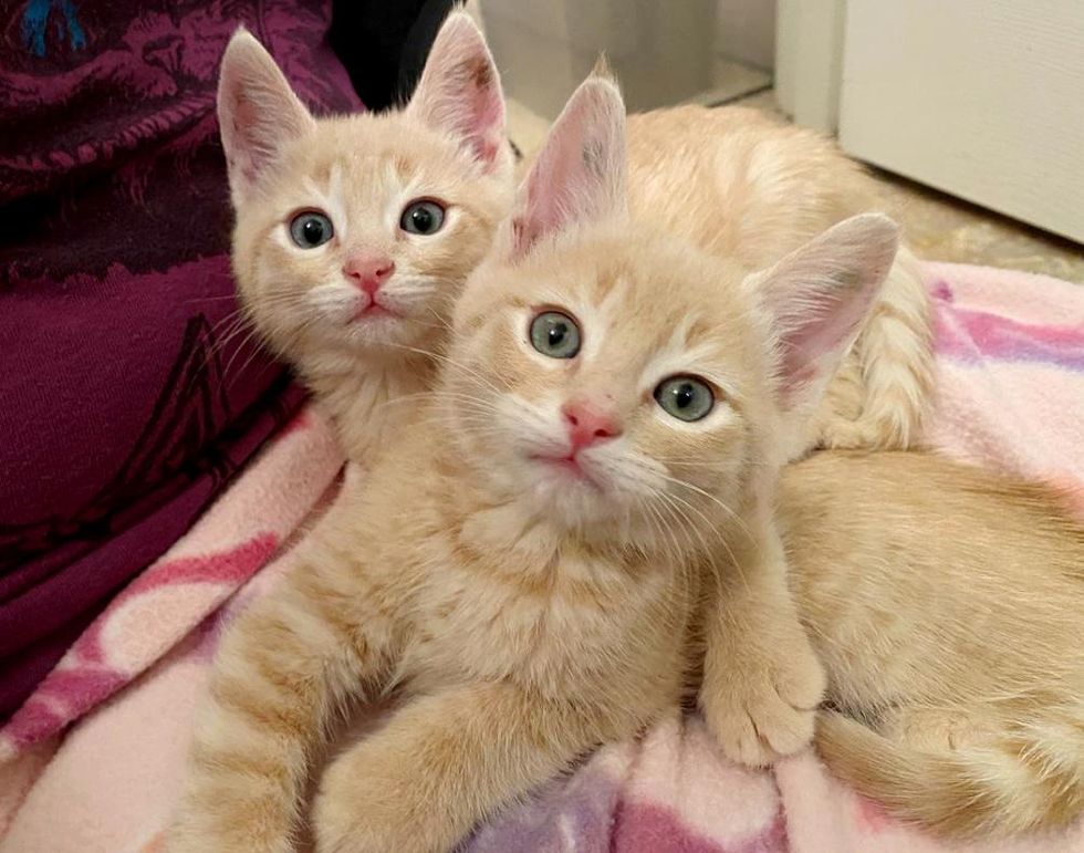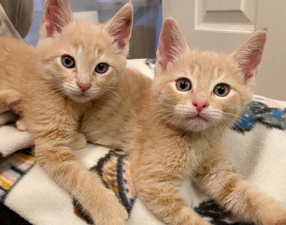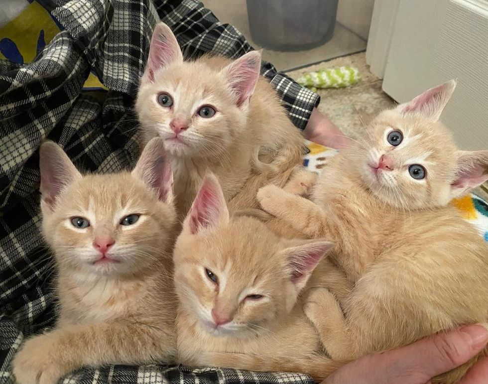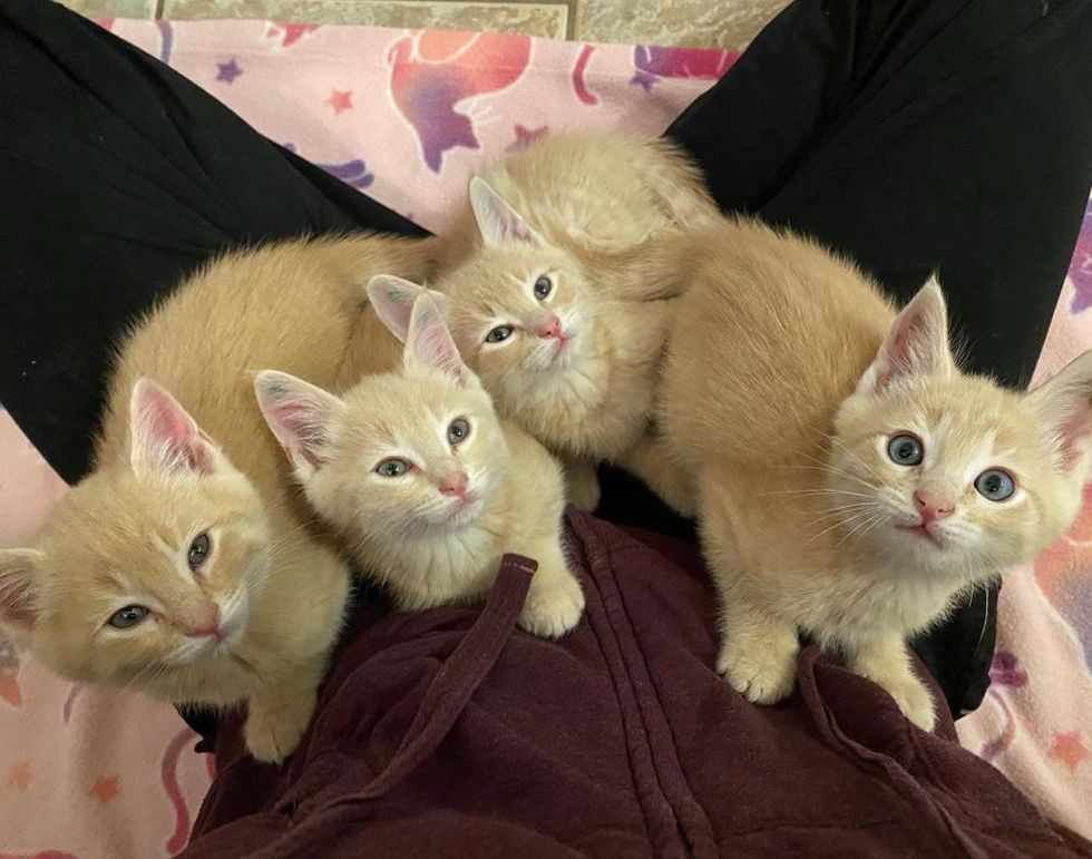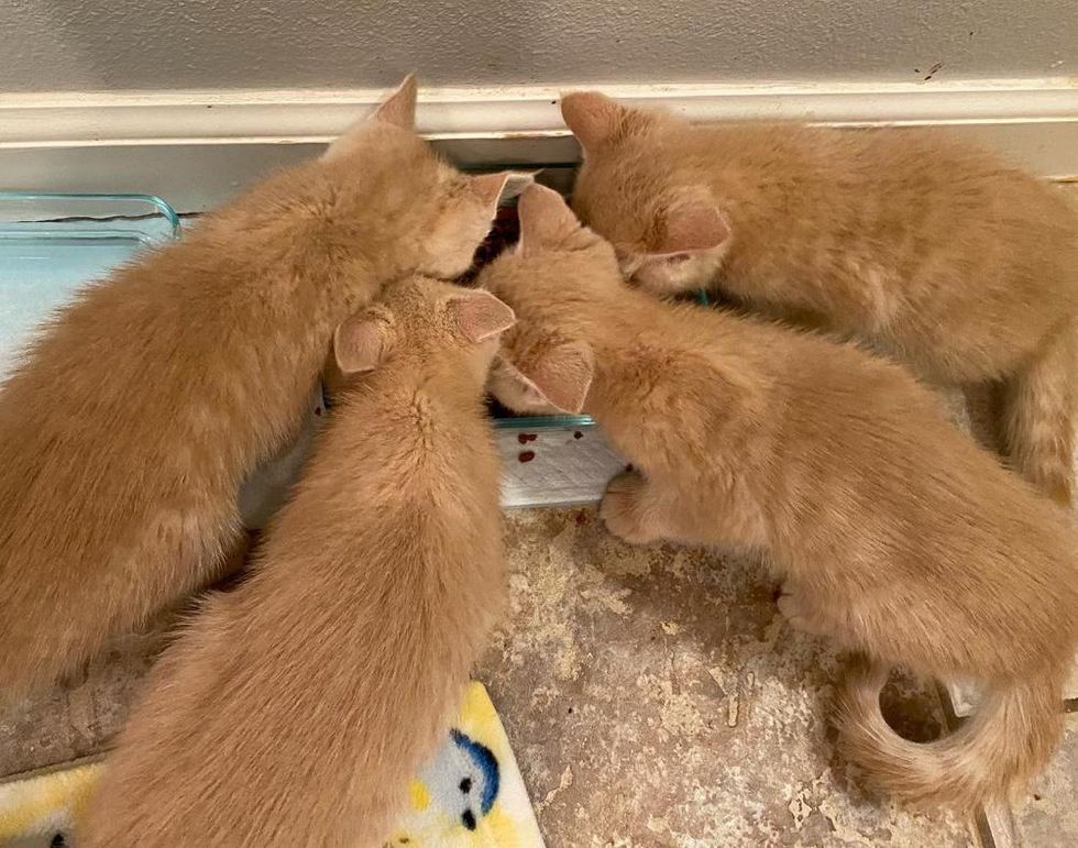 Four orange kittens insist on doing everything together and won't leave each other's side after being found outside.