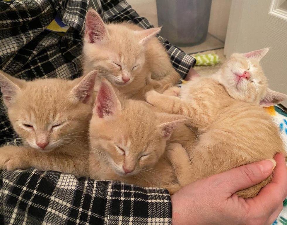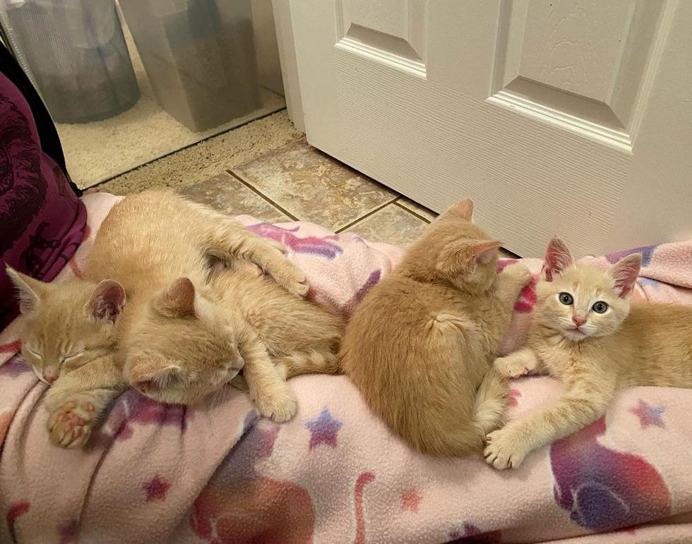 After the kittens arrived at their foster home, they explored around their new digs as the cutest quartet. Once they settled in, they snuggled up in a pile together and purred in perfect harmony as they fell asleep.