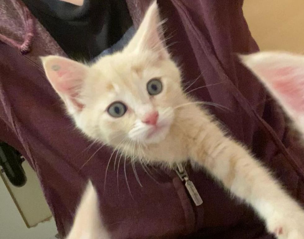 Tinsel prefers hanging out in Kayla's jacket while being cuddled, so he can be extra close to his human.
