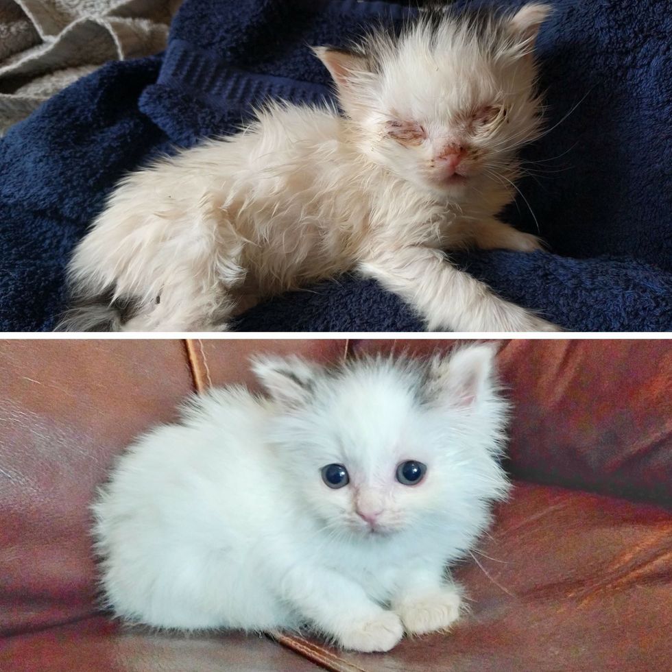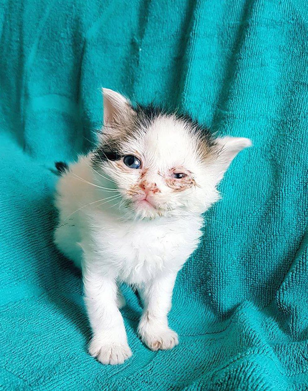 The little girl kitten sadly didn't make it, but her brothers were fighting hard to get better. "They had fleas like I have never seen (work in a vet's and done rescue for 15 years) ticks, flu, eye ulcers, conjunctivitis, starving, dehydrated and anemia," Heather, foster mom, told Love Meow.