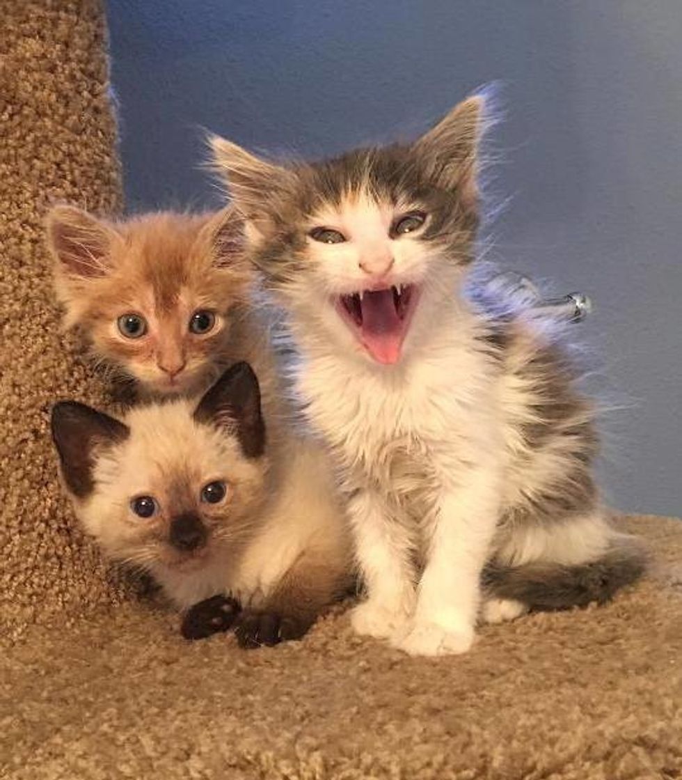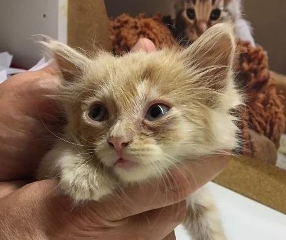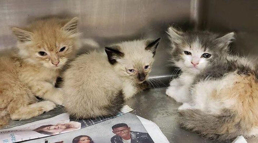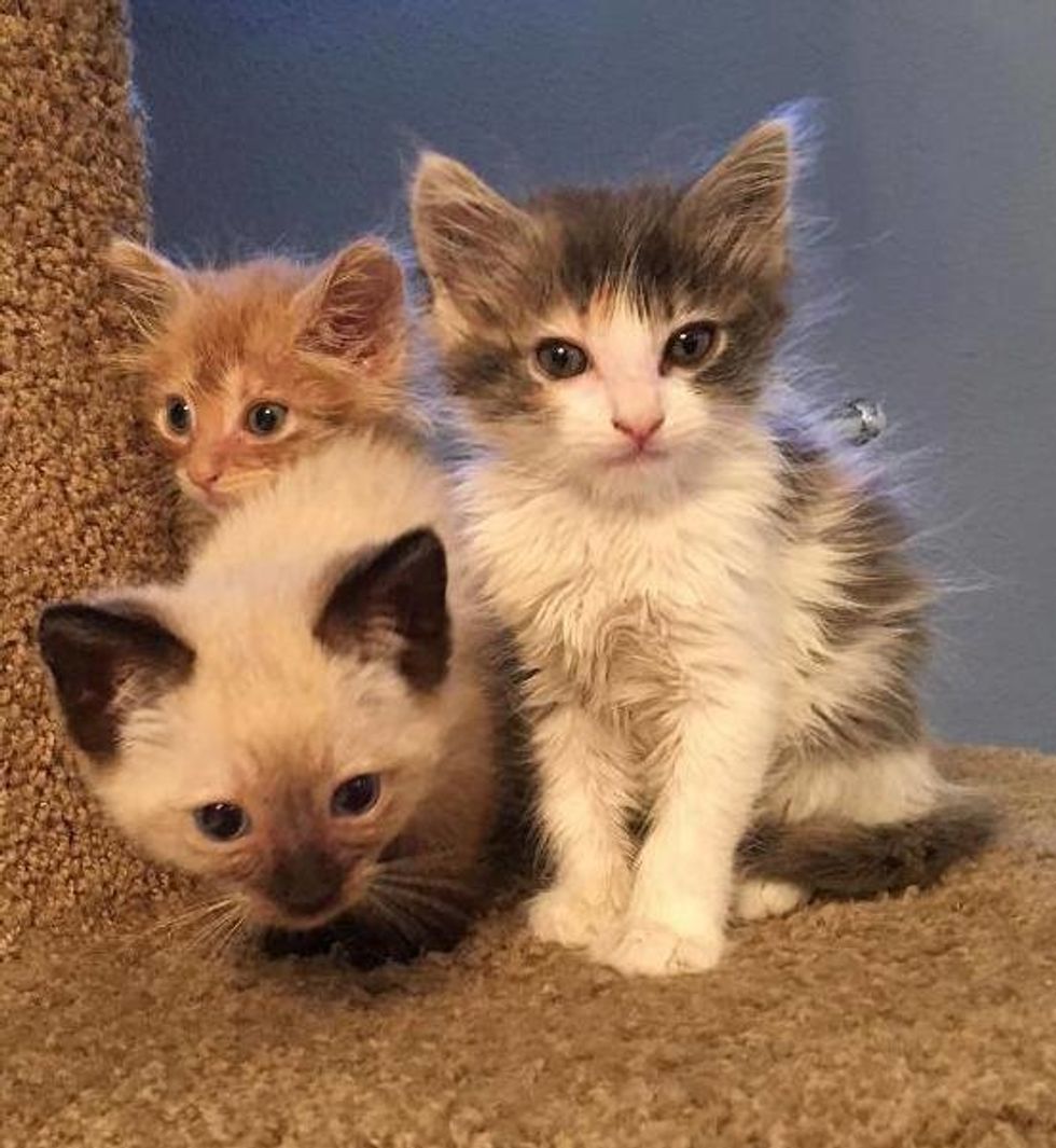 Three little 6-week-old kittens were found in a field by a friendly farmer in California. They were sick, covered with fleas and very timid.