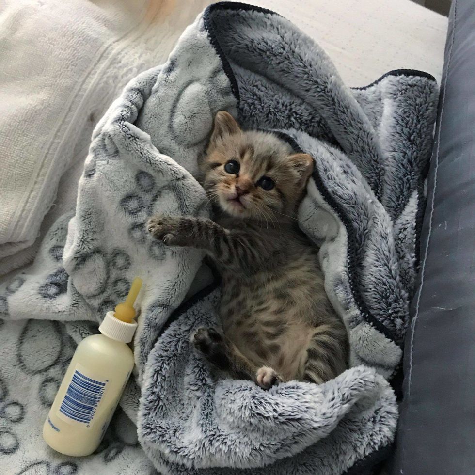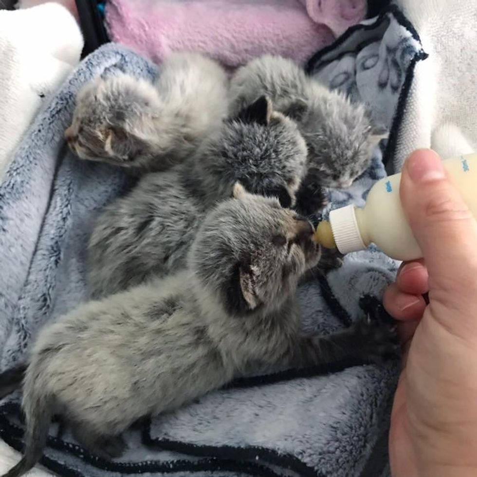 The mama cat was in poor shape and needed emergency surgery. While she was away, the kittens were bottle fed every few hours around the clock. "They were so hungry they threw themselves on their bottle," Chatons Orphelins Montréal shared with Love Meow.