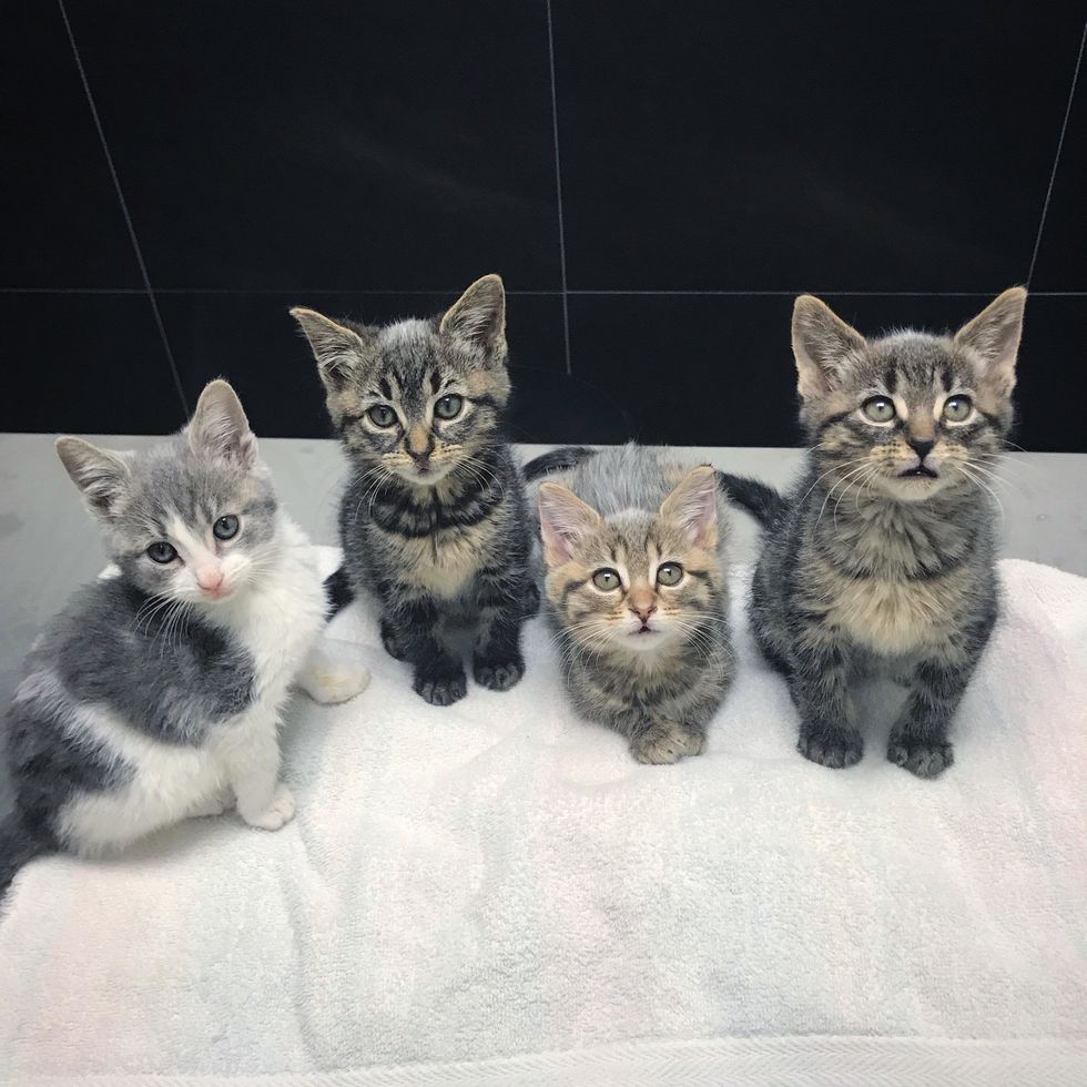 At nine weeks old, the feline siblings have transformed into gorgeous little kitties - Dodo, Jules, Annabelle (the three tabbies) and Remi (white and gray).