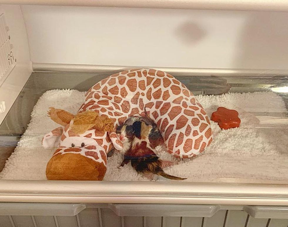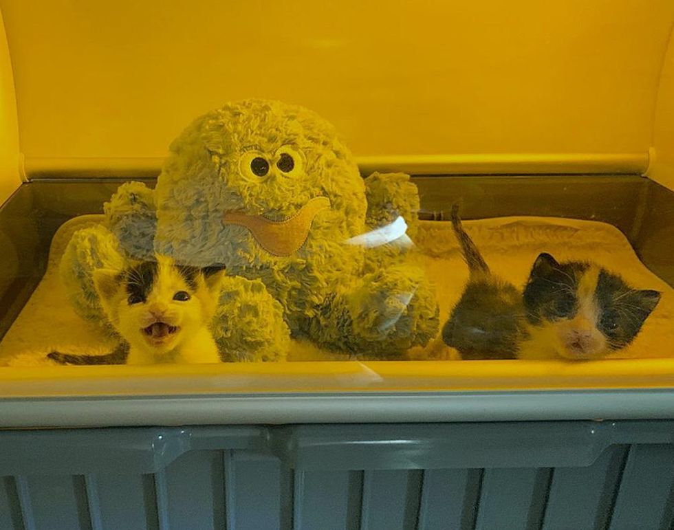 Upon receiving the kittens, Sarah Kelly, their Foster Mom, started feeding them every two hours around the clock. After getting all cleaned up and their bellies filled, the kittens, Soleil and Luna, nuzzled up to a snuggle toy inside their incubator, and went right to sleep.
