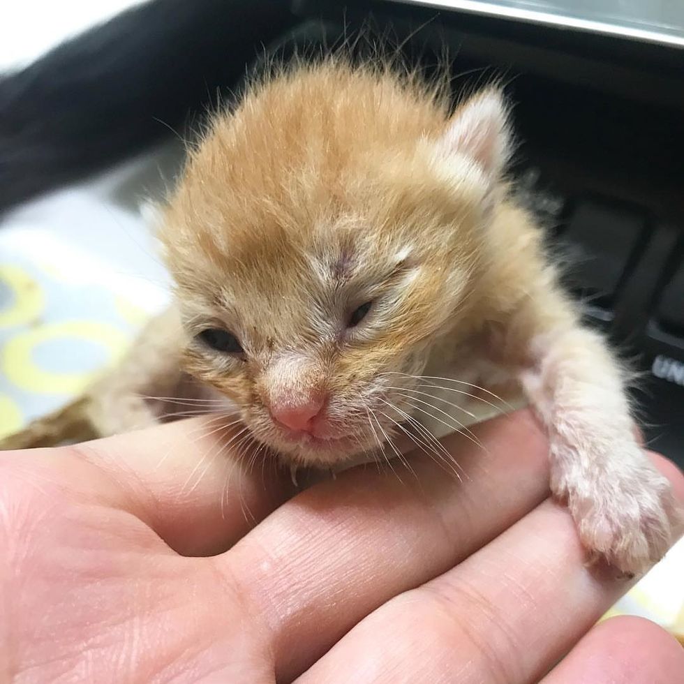 The little ginger is now seven weeks old and weighs about one pound, the size of a 4-week-old kitten.