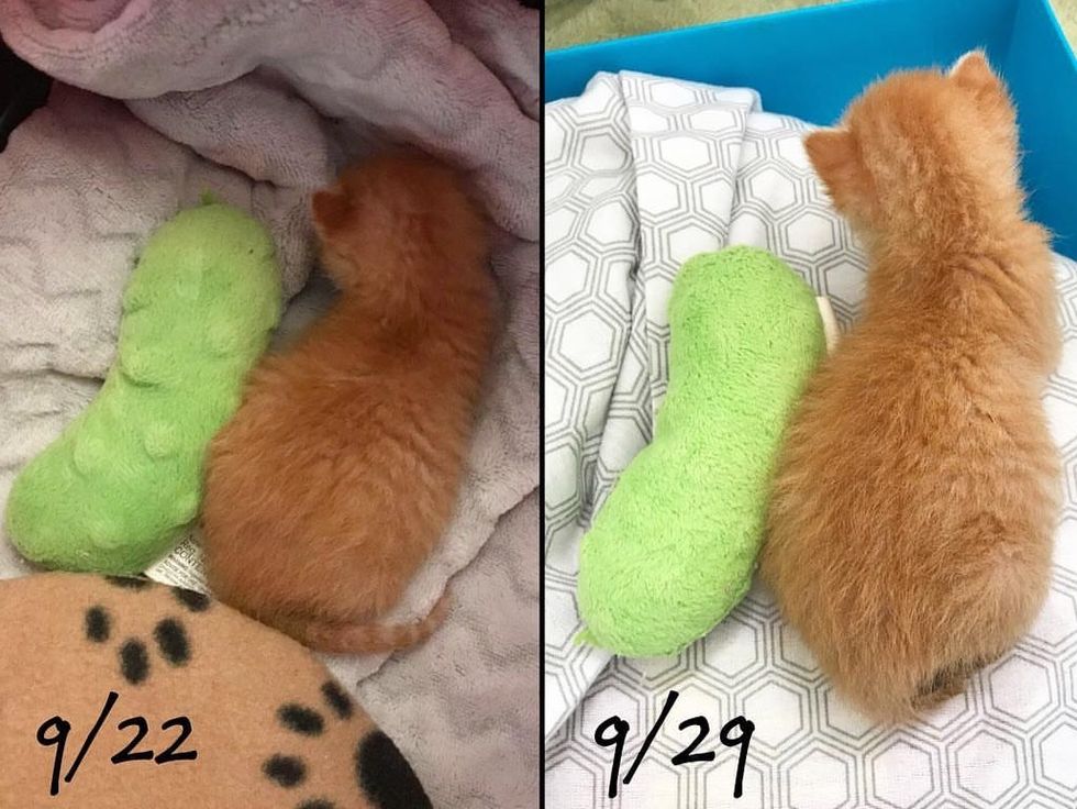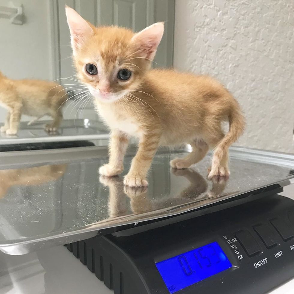 Since the other kittens were much bigger, Lisa had been supplementally syringe feeding him to help boost his immune system. In two weeks, Kelvin doubled his weight.
