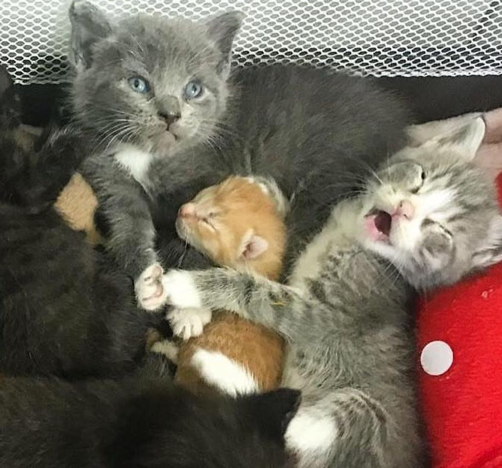 The kitties from three different litters immediately came together as one adorable family. They started snuggling with each other and purring up a storm.