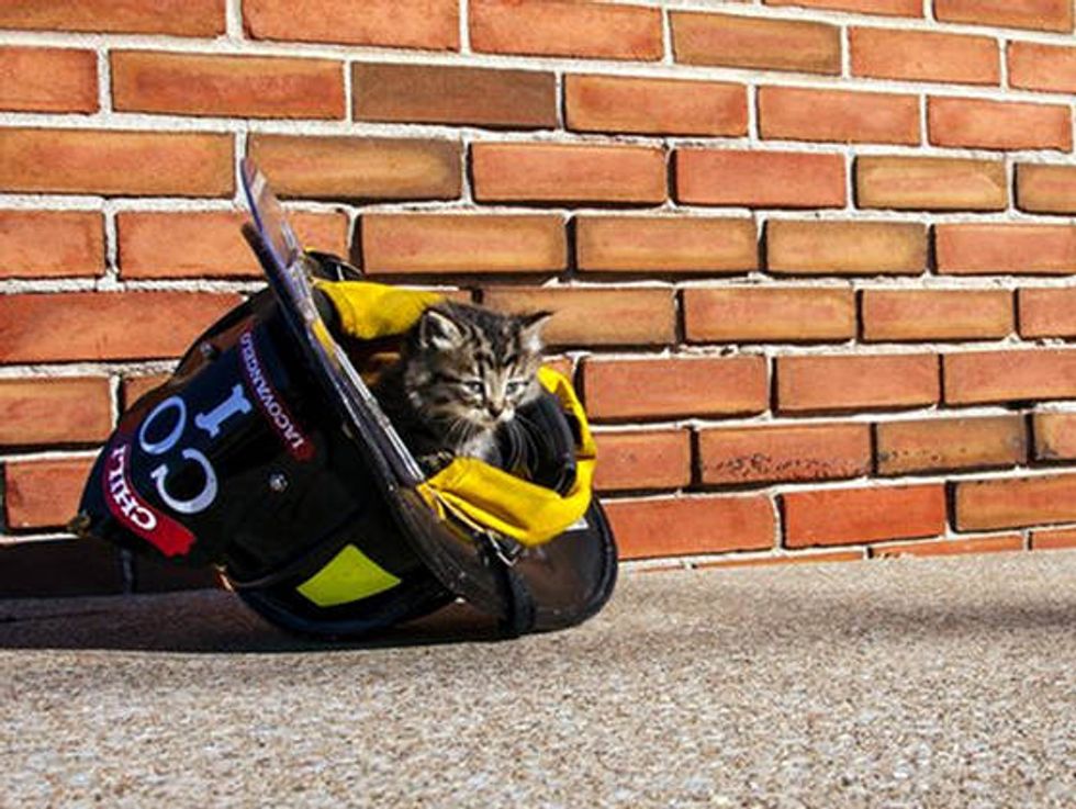 Bob the kitten is safe now, and has claimed his firefighter's helmet.