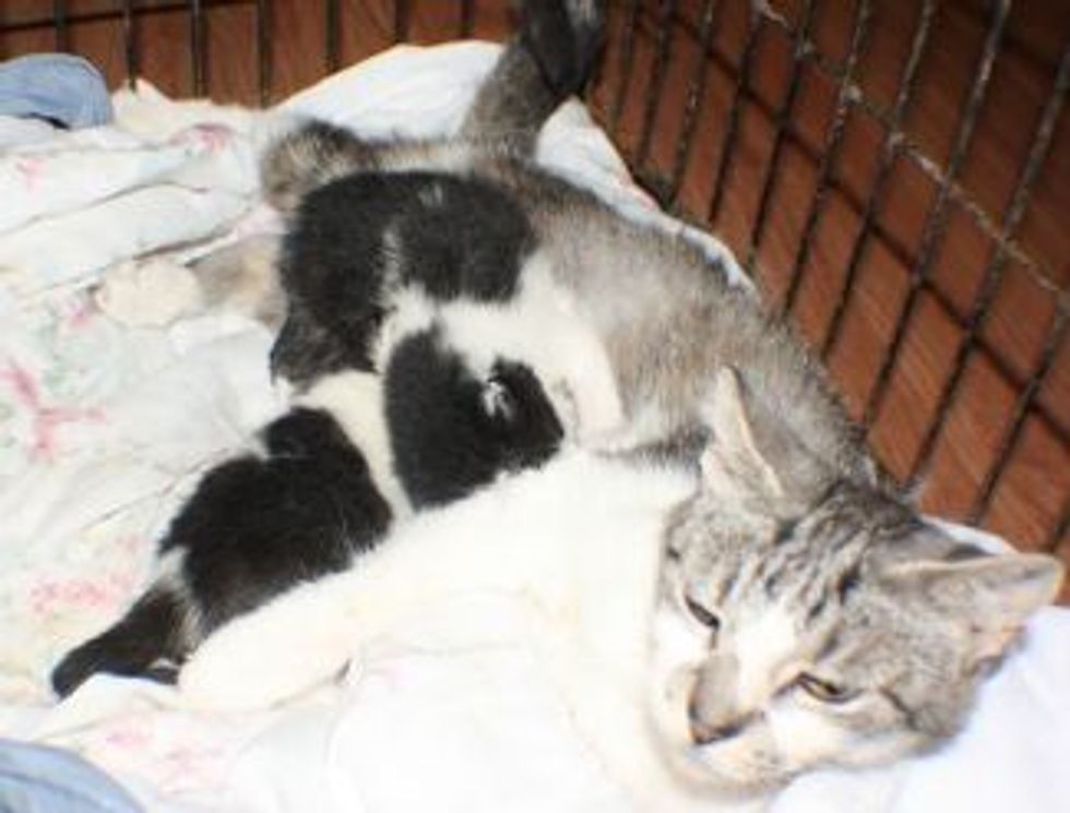 Erin never had any milk to feed them but after about 4 days she has settled in and is feeding them and raising them as if they are her own. - Clarenville SPCA