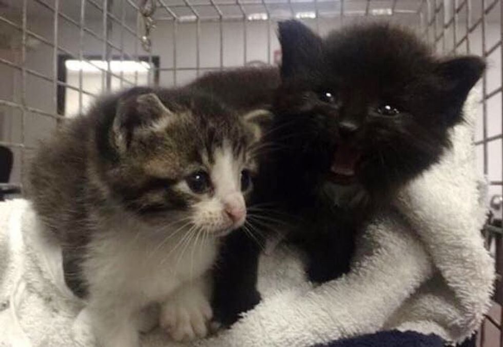 Two motherless kittens were found in a storm drain when someone heard their cries.