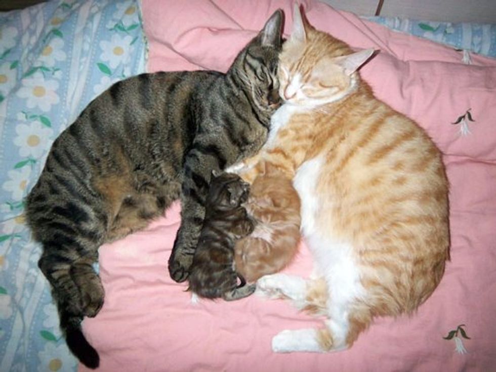 Right before the tiger tabby was scheduled to be neutered, they found out that the cat mama was pregnant according to the owner. Two beautiful kittens were born. They kept the entire family together and had the kitties fixed.