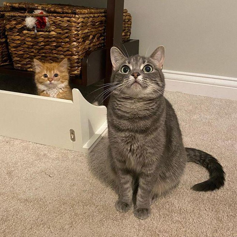Resident cat Audrey popped into their foster room for a meet-and-greet. The kittens were curious and in awe to see a big kitty with such confidence strutting about.