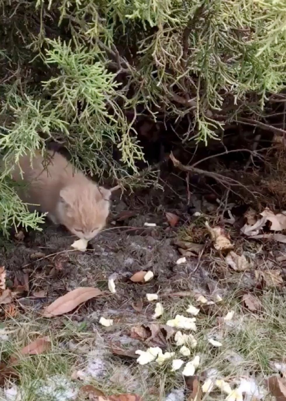 A few employees were having an office party when they spotted the two ginger kittens outside, looking for food. They tried to approach them, but the kitties quickly retreated back into the shrubs. They gave them some chicken, and one of the kittens grabbed a piece and went right back to hide.