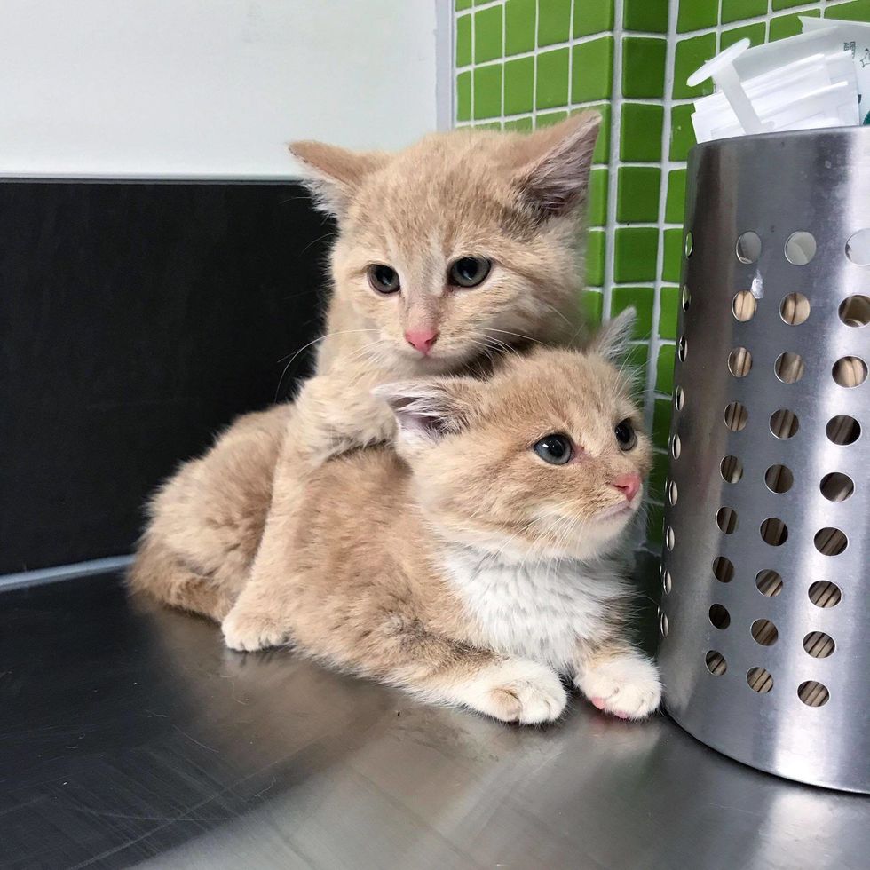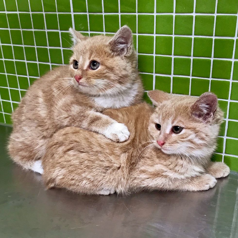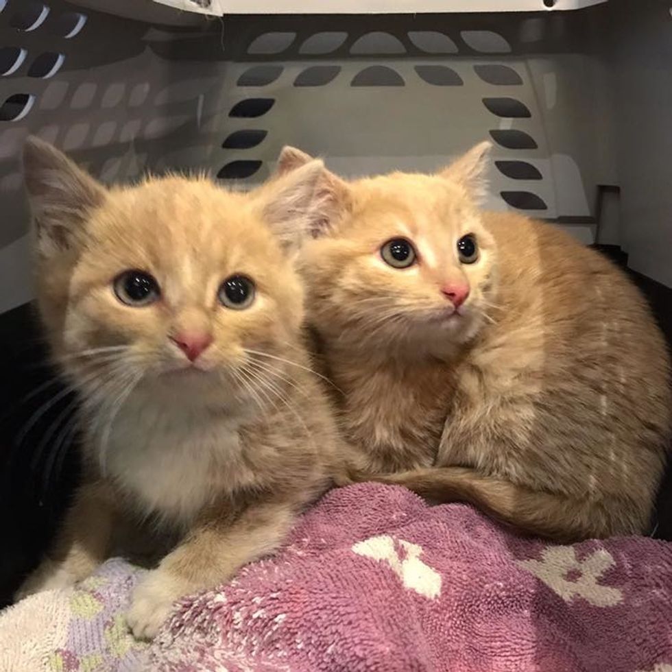 The feline siblings were very shy, huddled up together while they were at the vet. After getting the medical attention they needed, they were taken to a foster home to be socialized.