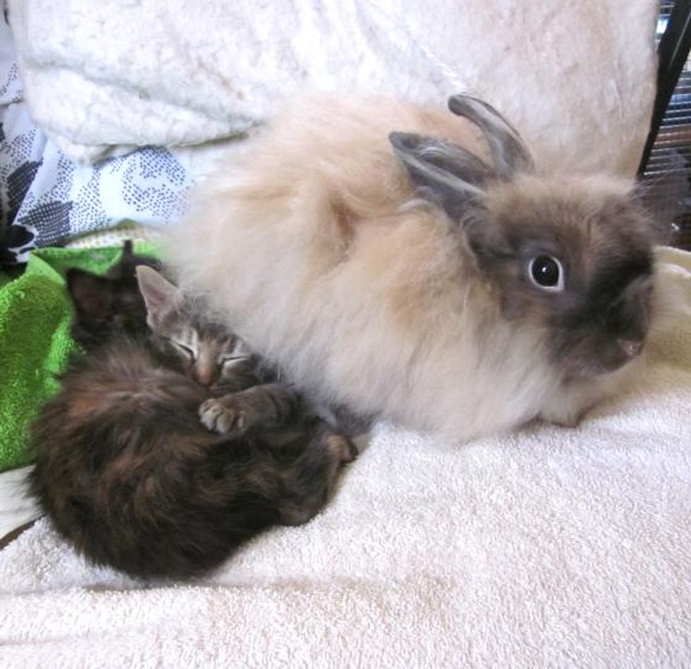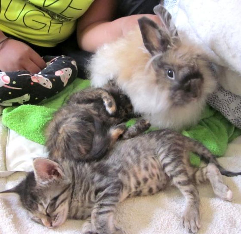 Wicket and Willow, two little foster kitties got a new cat sitter with long ears and hops when he walks. They even snuggle under his coat for that extra lovin'.