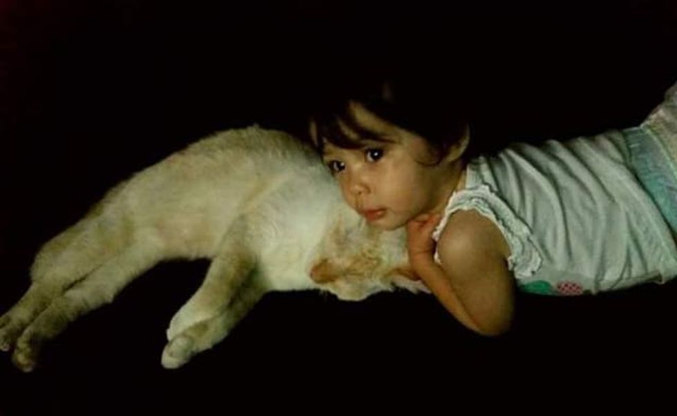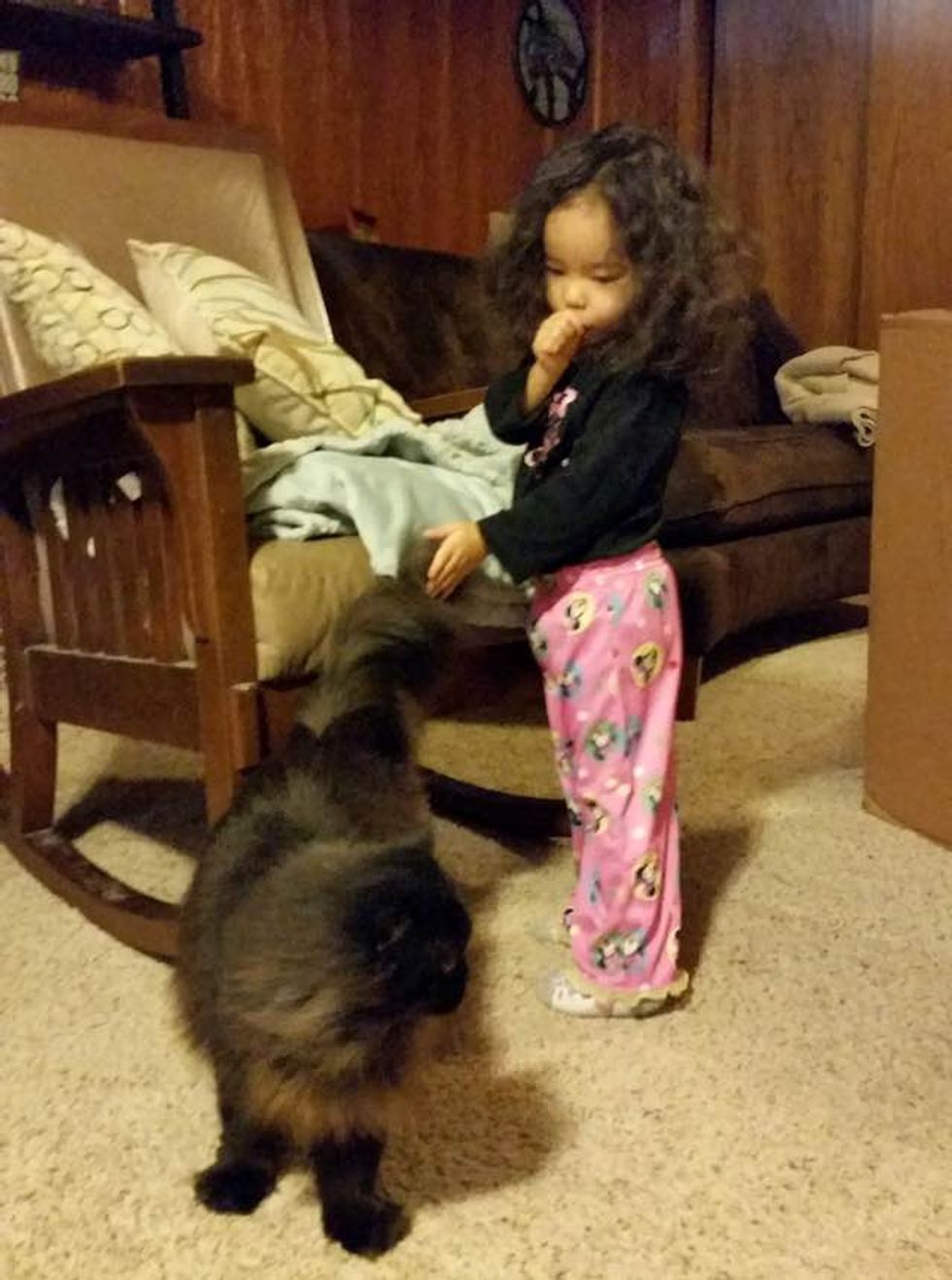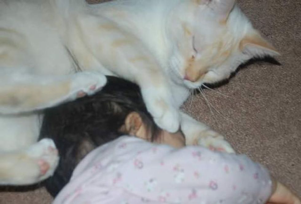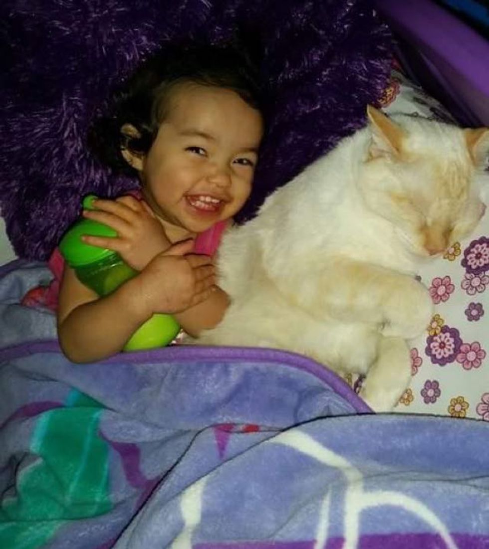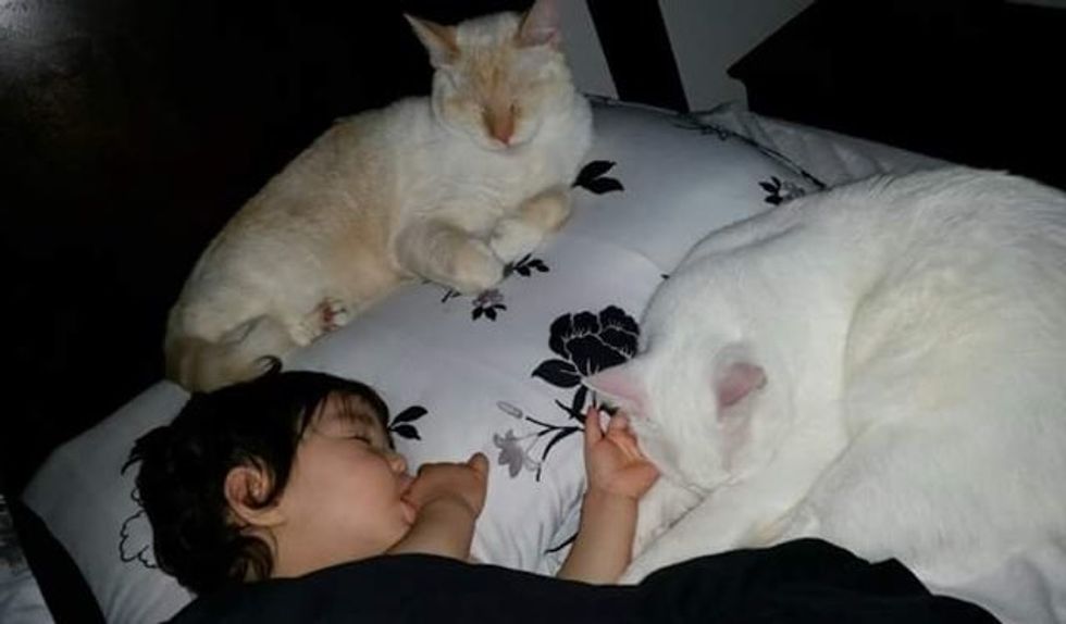 They have several cats in the house, and they are all very fond of their little human sister. It's as if she was born a cat whisperer. She adores her 4-legged feline friends and they love her like family.