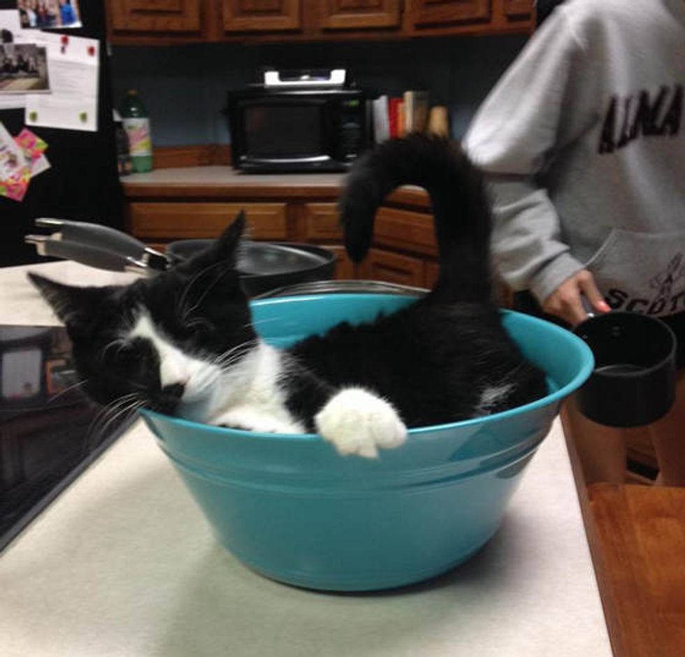 Even though he can't see the bowl, he knows how to have fun with it.