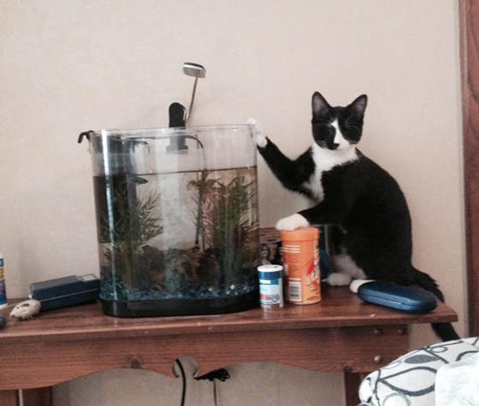 He doesn't need vision to know there is something fishy in the tank. "Oh hi, umm I was just checking on them," he says.