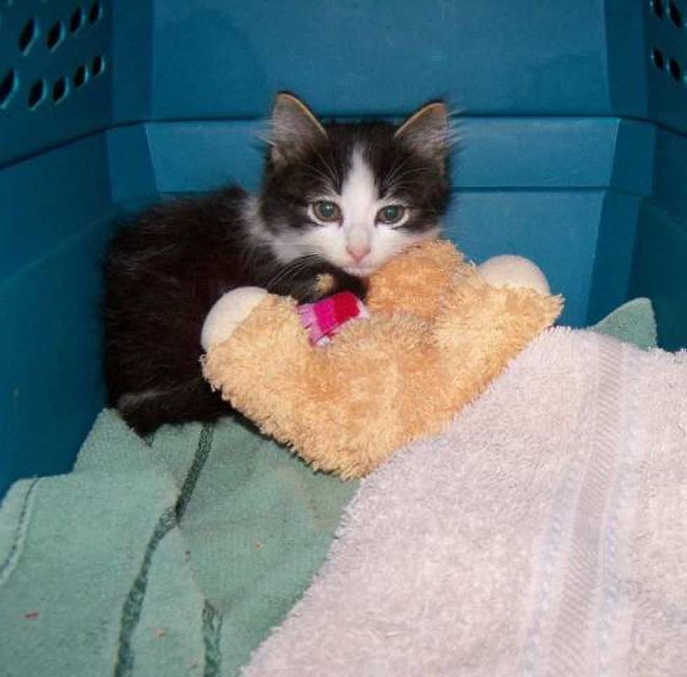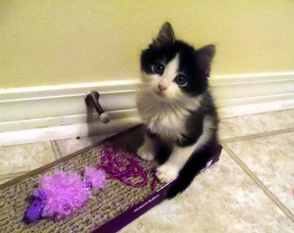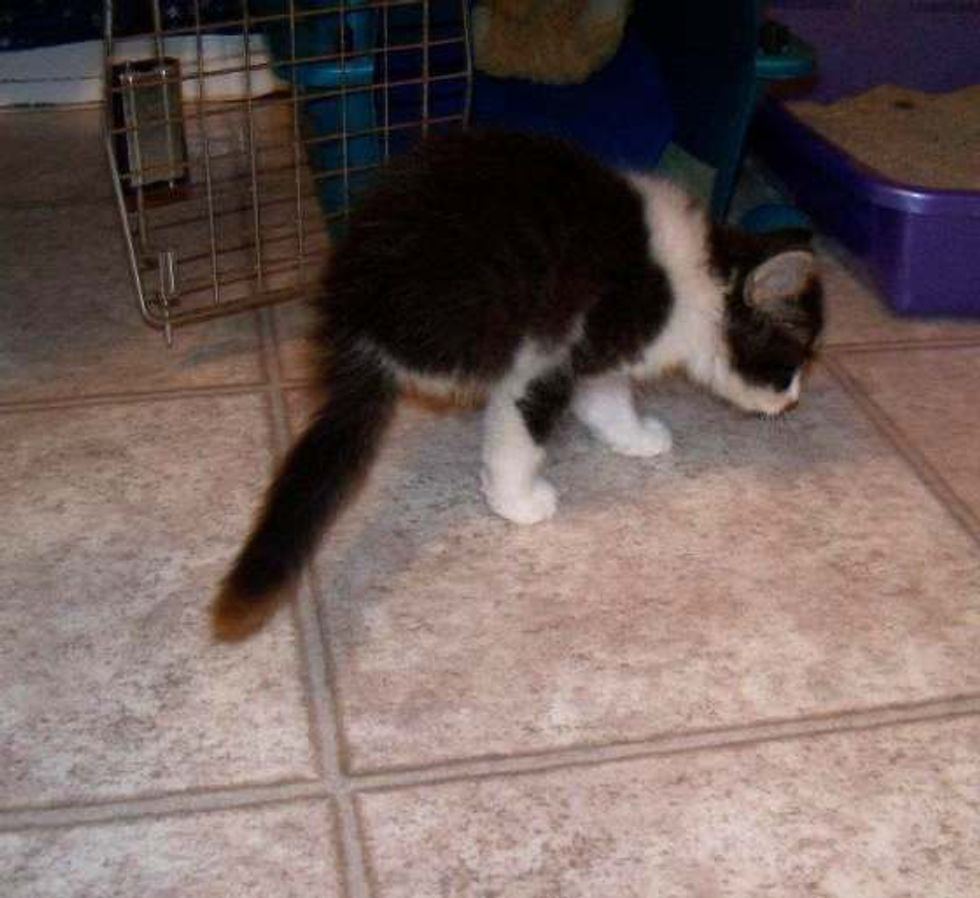 Friday morning (6/1) I took him to our vet as soon as they opened. Our vet said she has never seen anything like him before and he is amazing and that it's also amazing that his mother took care of him even with his handicap. She examined him and he is a little boy, approximately 6 to 8 weeks old and it in really good health. Two xrays on him showed he was born with no pelvis or back legs. We let him walk around the room for a minute to see how he moves. He positions his front legs at an angle towards the middle of his body and balances his backend in the air with the use of his tail touching the ground if he needs it. He gets around really well that way and is pretty quick too. The xray also showed that his insides were not malformed, last was the feline leukemia test. He's came back negative. So we got him vaccinated, dewormed and a little flea meds and unless we have any problems with him, he goes back to the vet in three weeks. :)