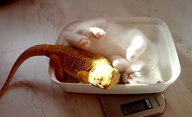 Every time they weigh their bearded dragon, their kitty hops into the scale and goes on a snuggles fest with his hairless friend.