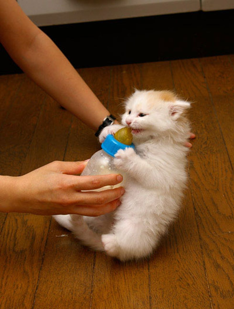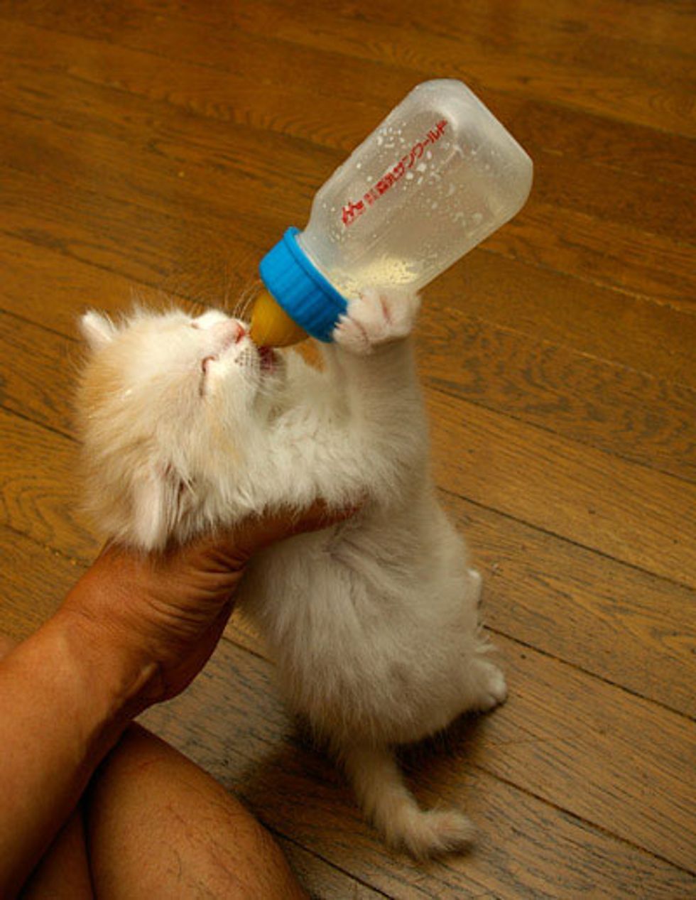 At one month old, kitty is still obessed with his bottle. He grabs it with his claws so tight that even when he's finished, no one can take the bottle away from him. "It's MY bottle!" says the kitty.