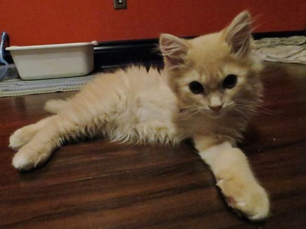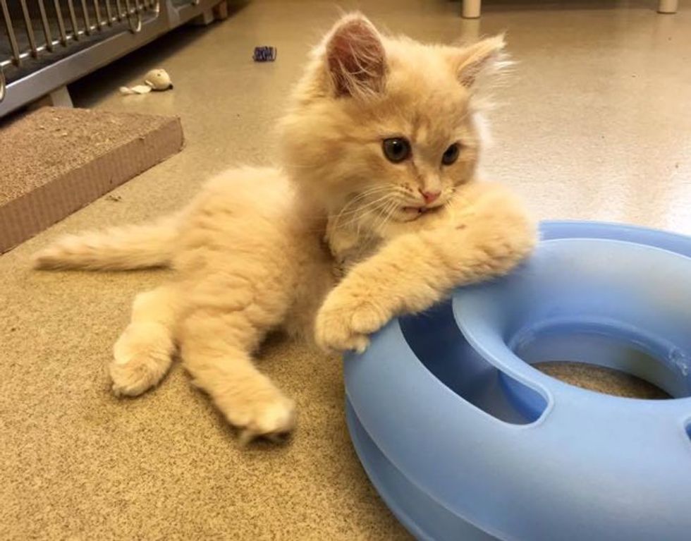 Furiosa was thrown from a moving vehicle at eight weeks old. He was saved by the people at the Headon Forest Animal Clinic and taken to the Burlington Humane Society after an operation. He lost one of his legs, but gained a brand new life.