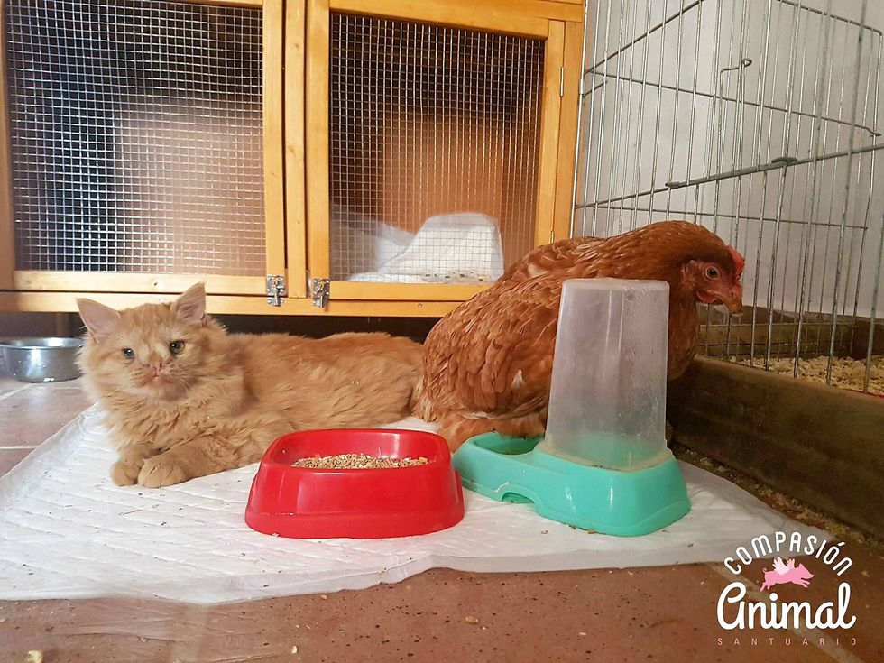 One afternoon, they were looking everywhere for Romeo but couldn't find him. Turns out, he was in the medical room keeping a a sick chicken company.