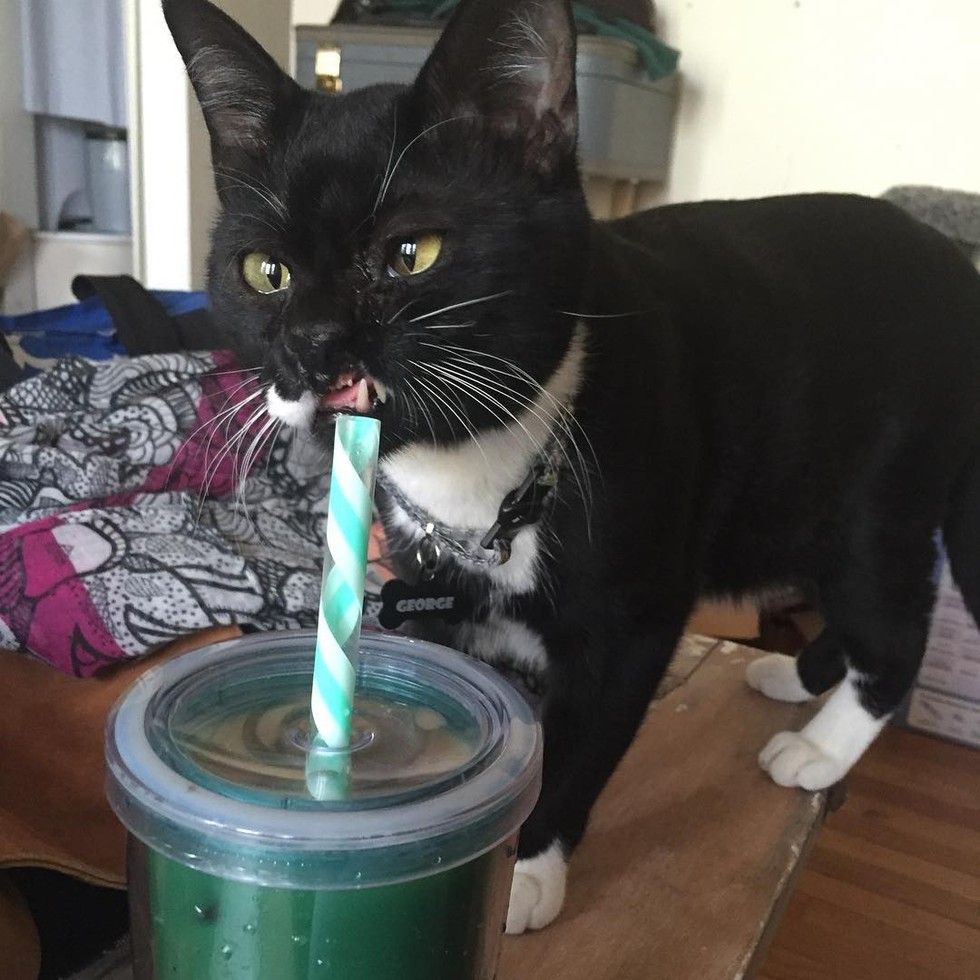 "The only time I don't see George is when I go to bed. He prefers to sleep in the living room. Otherwise he is always at my side. When I cook, he sits in the sink. When I bake, he lays on the stove because it's warm from the oven. When I shower, there's George with a wet head!"