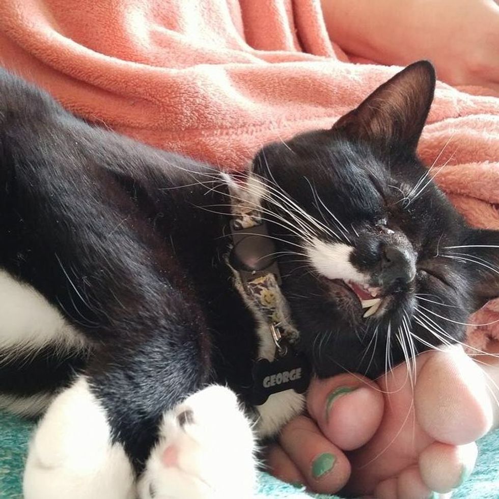 "One day he jumped on the couch and I pet him, expecting him to jump back down. Instead, he curled up on my lap! My heart just melted because I know he finally trusted me now he won't give me a moment alone! If he wants to snuggle he will make you snuggle. But in all reality, who could resist George snuggles."