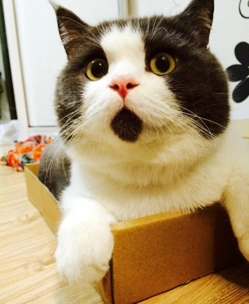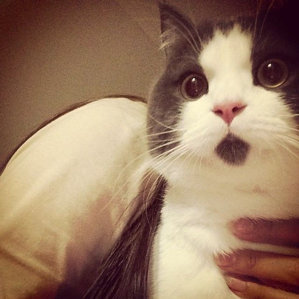 This adorable British Shorthair was born with a little goatee that gives him a permenant surprised and perplexed look.