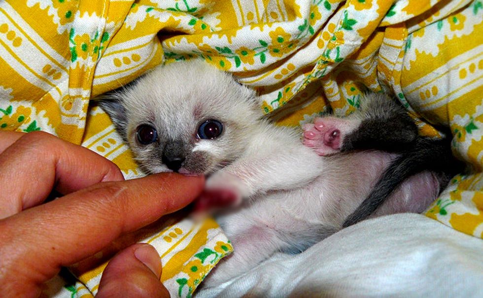 There was nothing the vet could do for her at that time except some antibiotic ointment on the wound. Andreea named her Mishu because the vet thought it was a boy kitten around three weeks old. Until later it was clear that she was a female so they changed her name to Kitzy. "She is a fighter, she wants to live and I will help her do just that. She eats well, sleeps well, is active when awake, and purrs when I hold her. To my surprise, she used her injured paw when walking or holding the milk bottle."