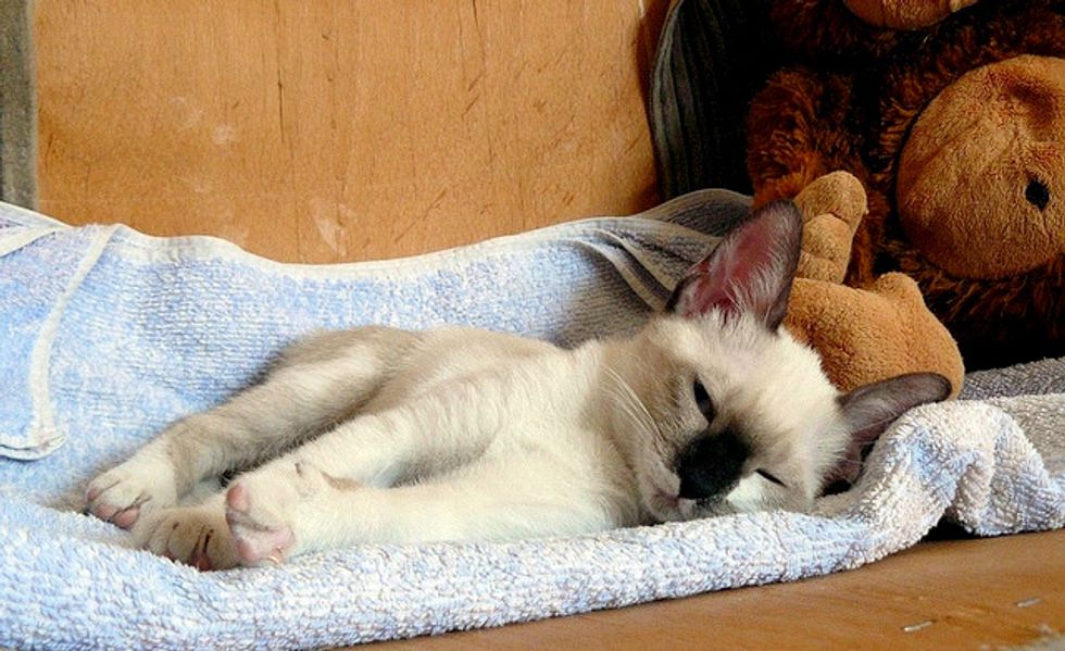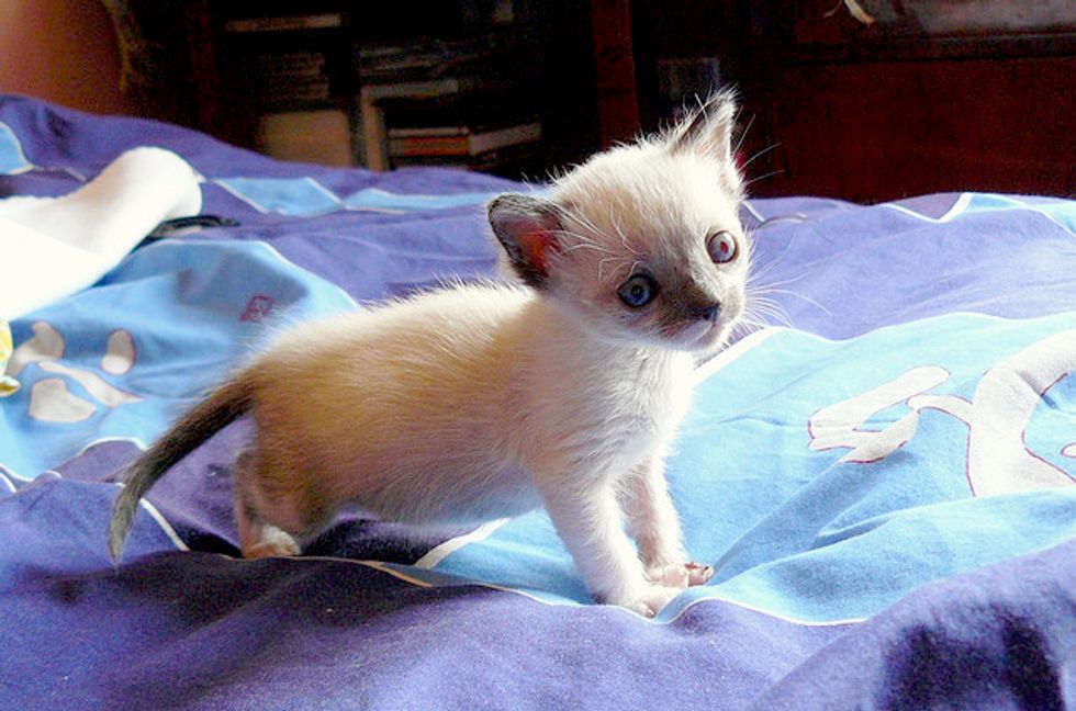 Kitzy was brought to Andreea on June 13, 2009. She was missing a chunk of her paw. "Three little girls brought her at the end of an adoption fair. I grabbed her, wrapped her in a towel and rushed her home to feed her and give her first aid. Early next morning I took her to the vet."